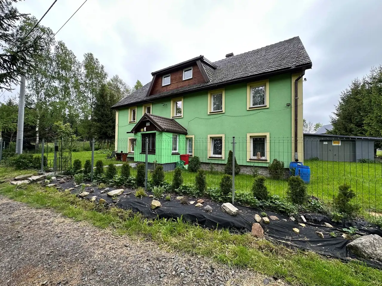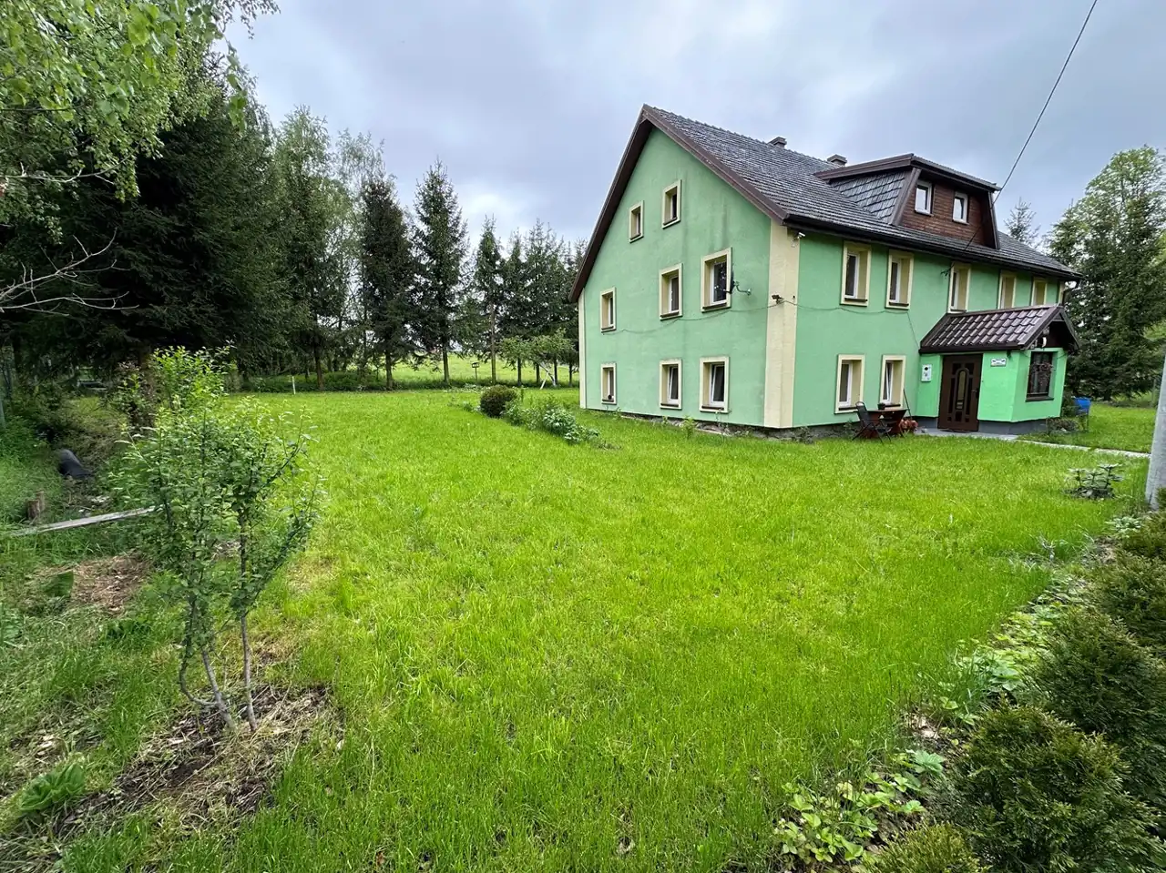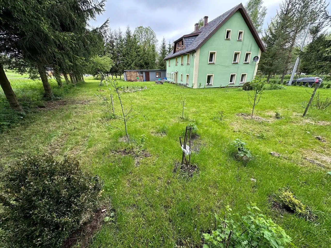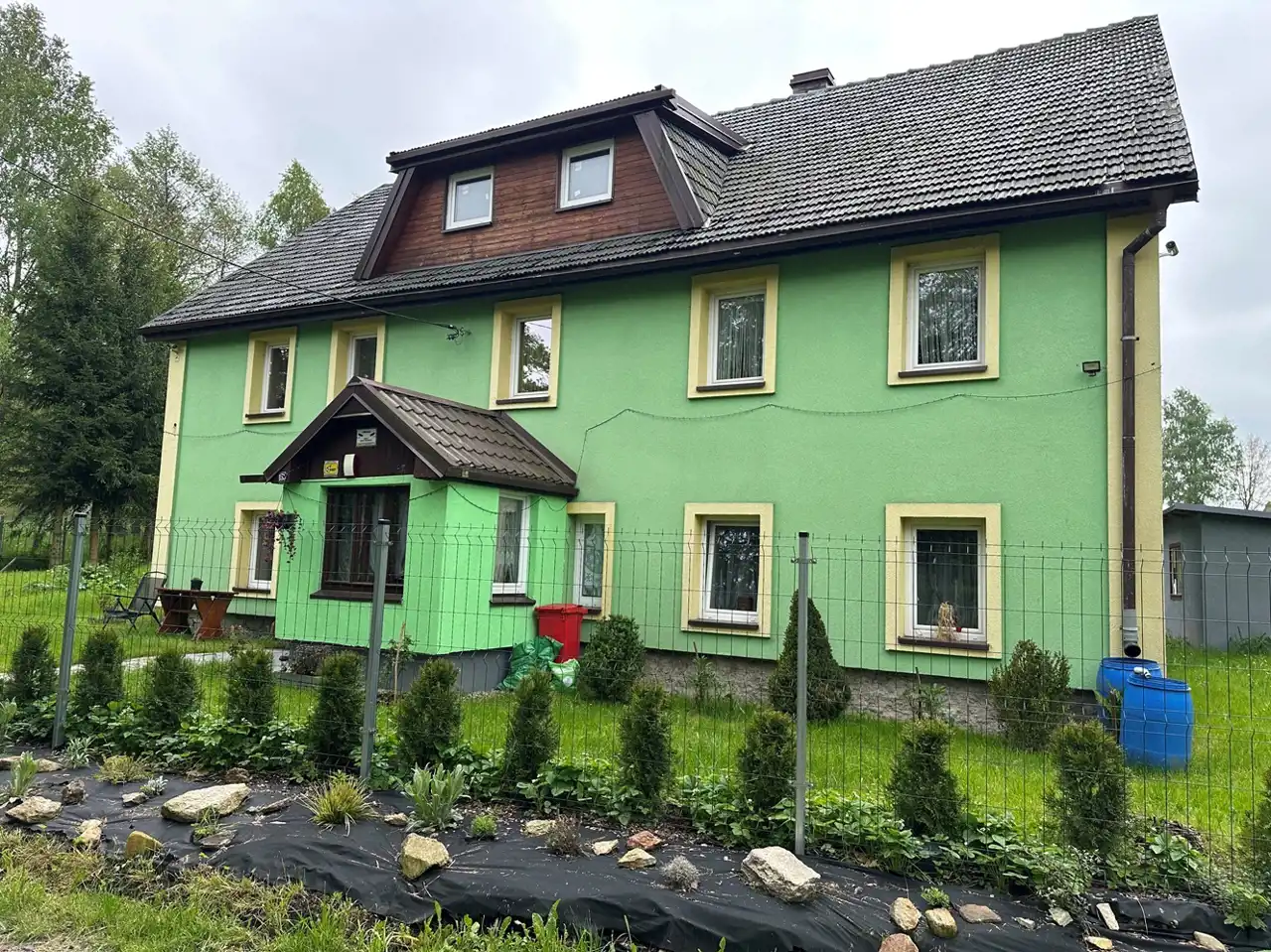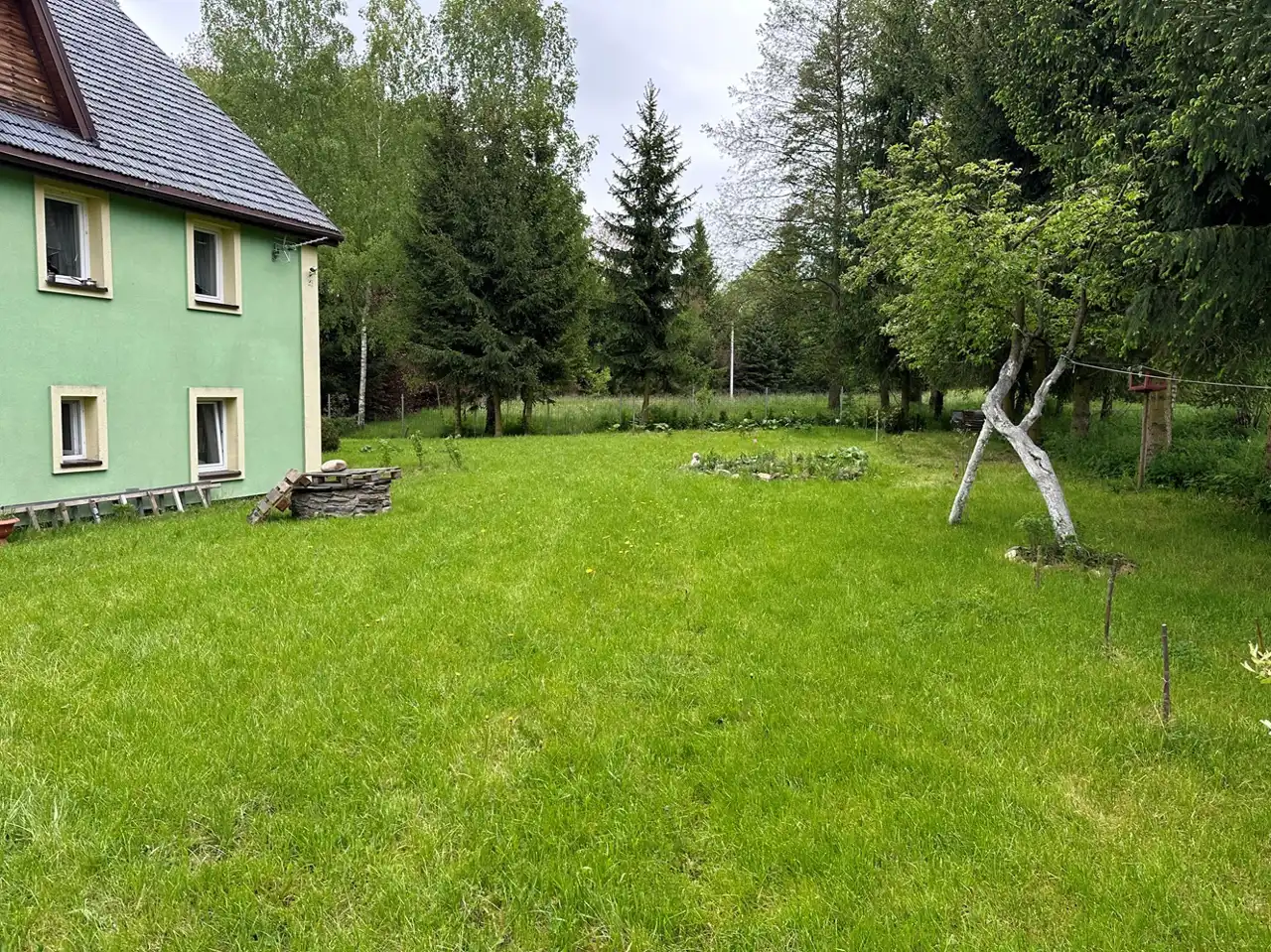 Ładny, zadbany i duży ogród, działka z trzech stron ogrodzona metalowymi przęsłami, częściowo otoczona wysokimi świerkami. Bardzo spokojne i urokliwe miejsce, tu można odpocząć od wielkomiejskiego zgiełku.