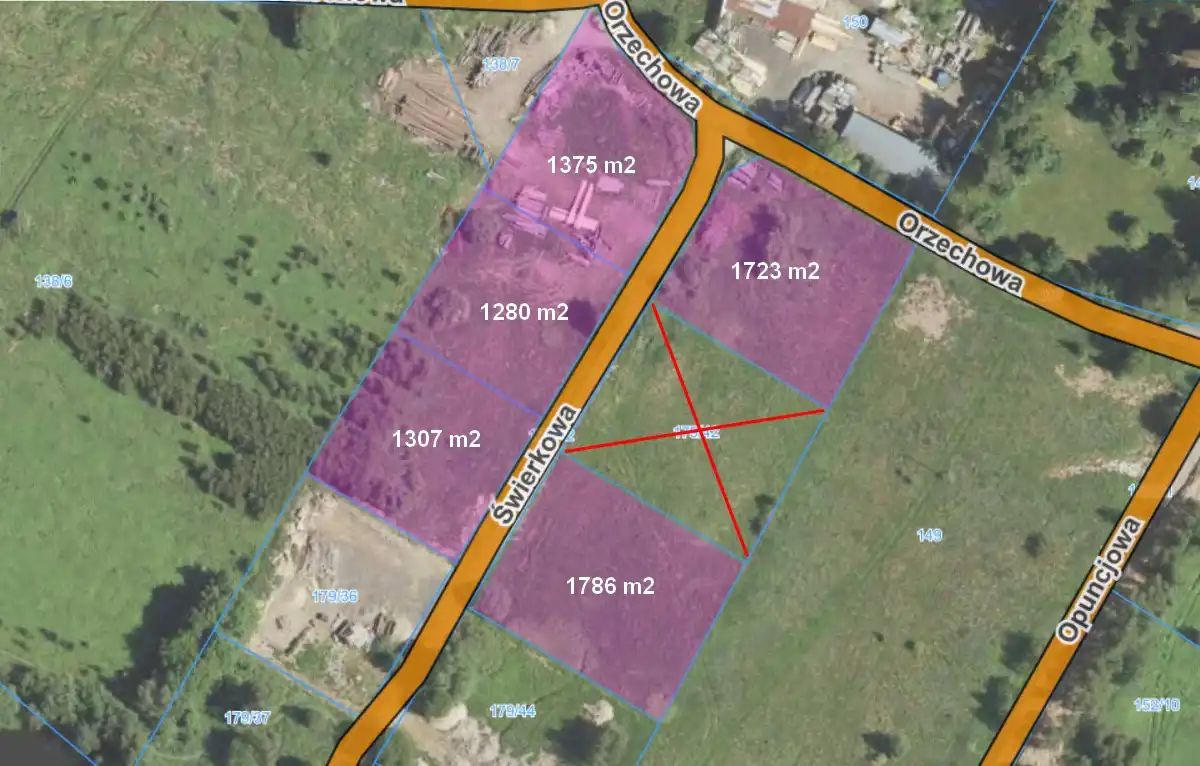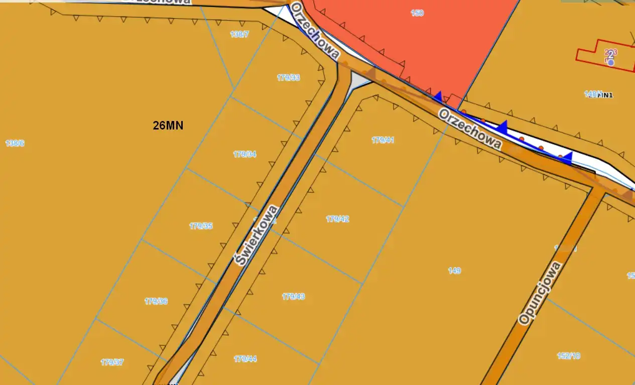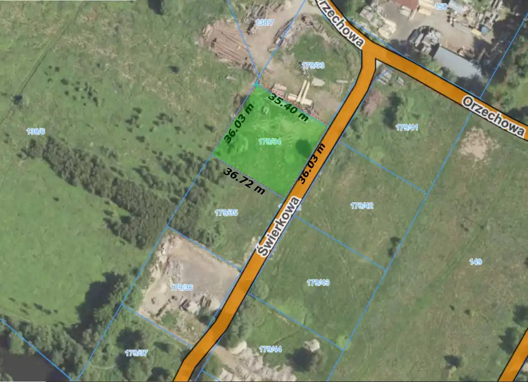 Działki zgodnie z miejscowym planem zagospodarowania przestrzennego oznaczone symbolem MN – zabudowa jednorodzinna, uchwała XLII.267.2022. Kształt działek regularny zbliżony do kwadratu i prostokąta, teren płaski. Nieruchomość gruntowa zlokalizowana przy ul. Świerkowej w pobliżu kościoła oraz ulicy Orzechowej. Dojazd drogą gminną, asfaltową.