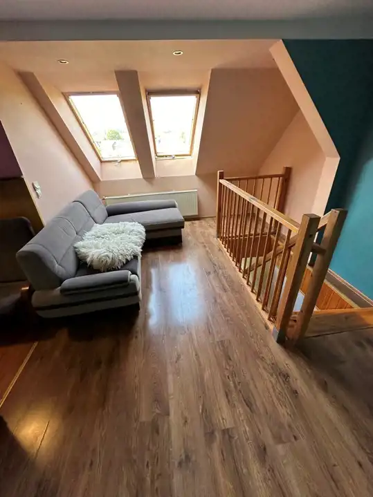 - kuchnia połączona z niedużym pokojem ze skosami i oknami dachowymi 22m2