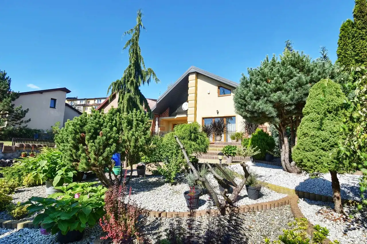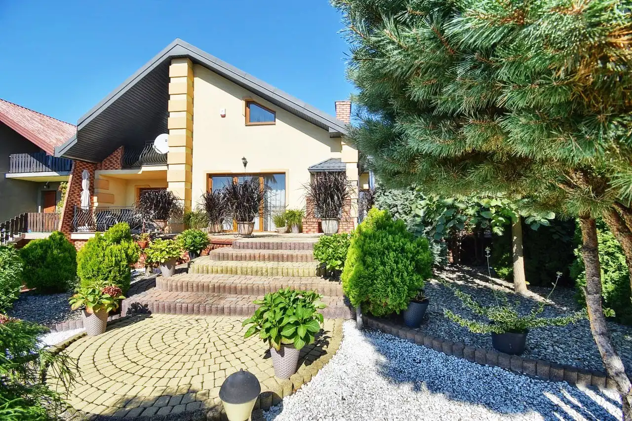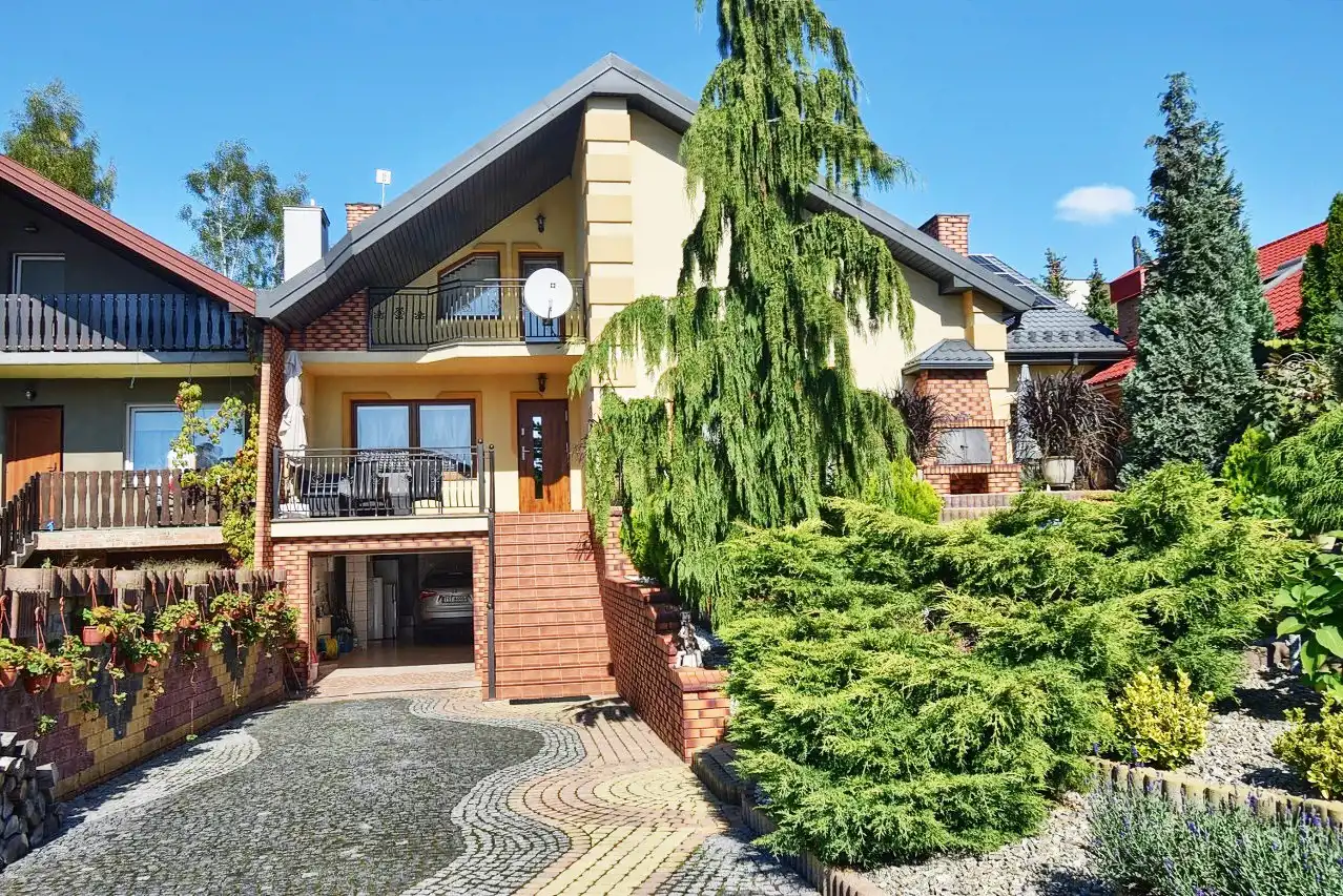 Przestronny, komfortowy dom wykończony materiałami wysokiej jakości - drewnem i kamieniem. Na szczególną uwagę zasługują schody wewnętrzne z drzewa dębowego, gięte, stanowiące wyjątkową ozdobę domu. Meble w większości wykonane na indywidualne zamówienie właścicieli z drzewa dębowego. Dom położony jest w cichej, spokojnej okolicy, na kameralnym osiedlu w otoczeniu domów jednorodzinnych. Teren ogrodzony, zagospodarowany z wieloletnimi nasadzeniami, podjazd do garażu wyłożony kostką. Przed domem znajduje się taras z murowanym grillem, a za domem - altana.