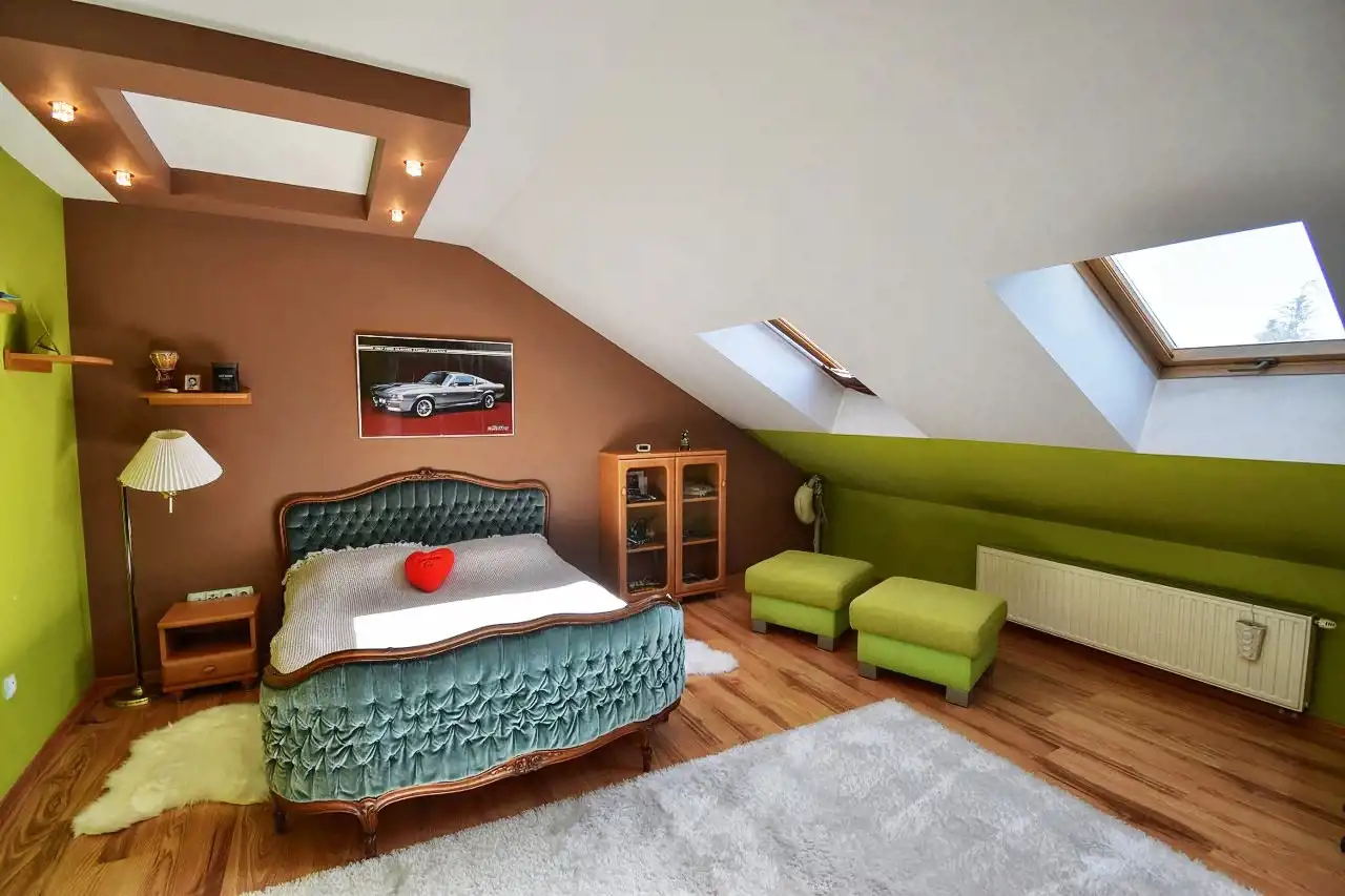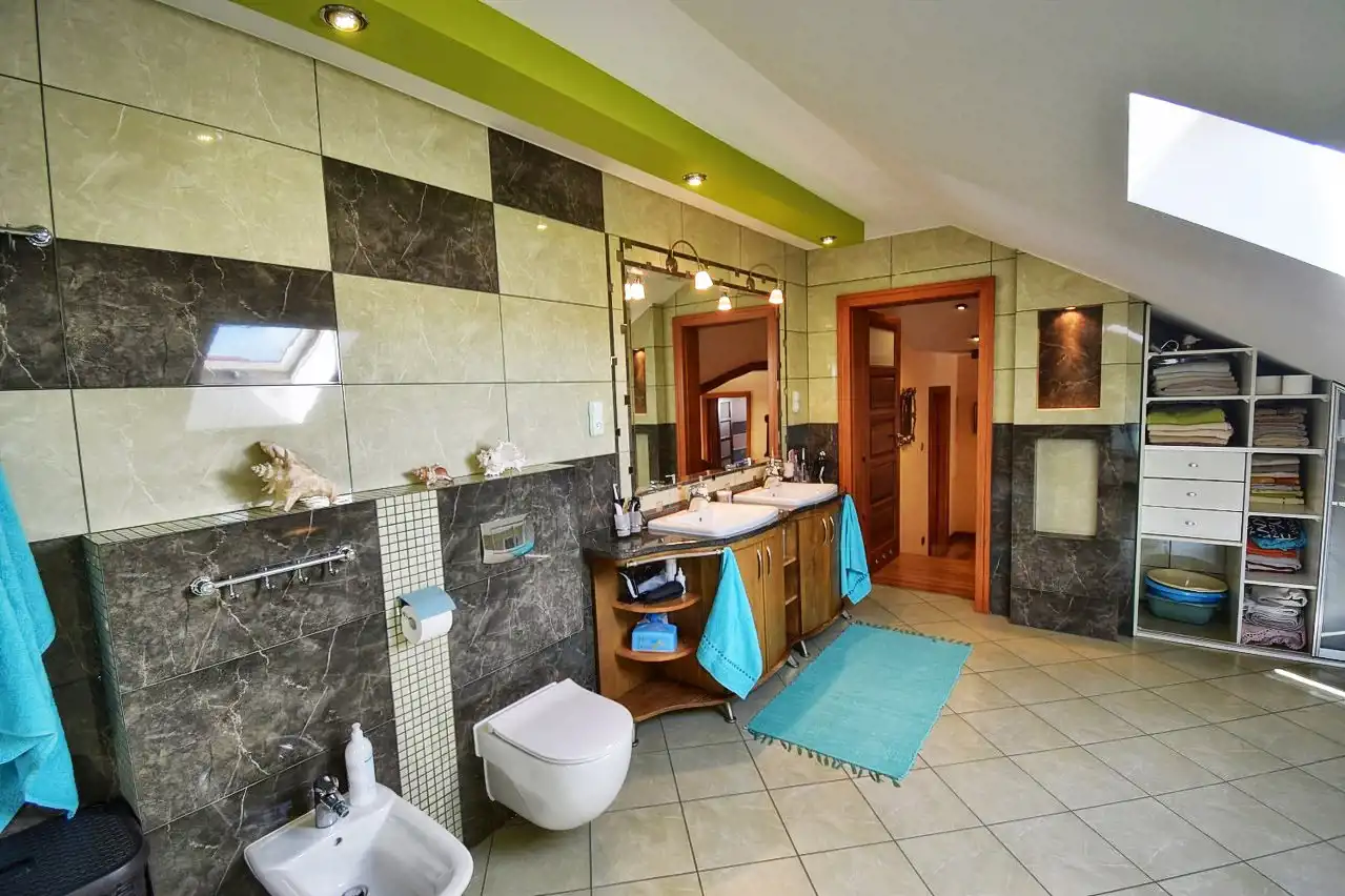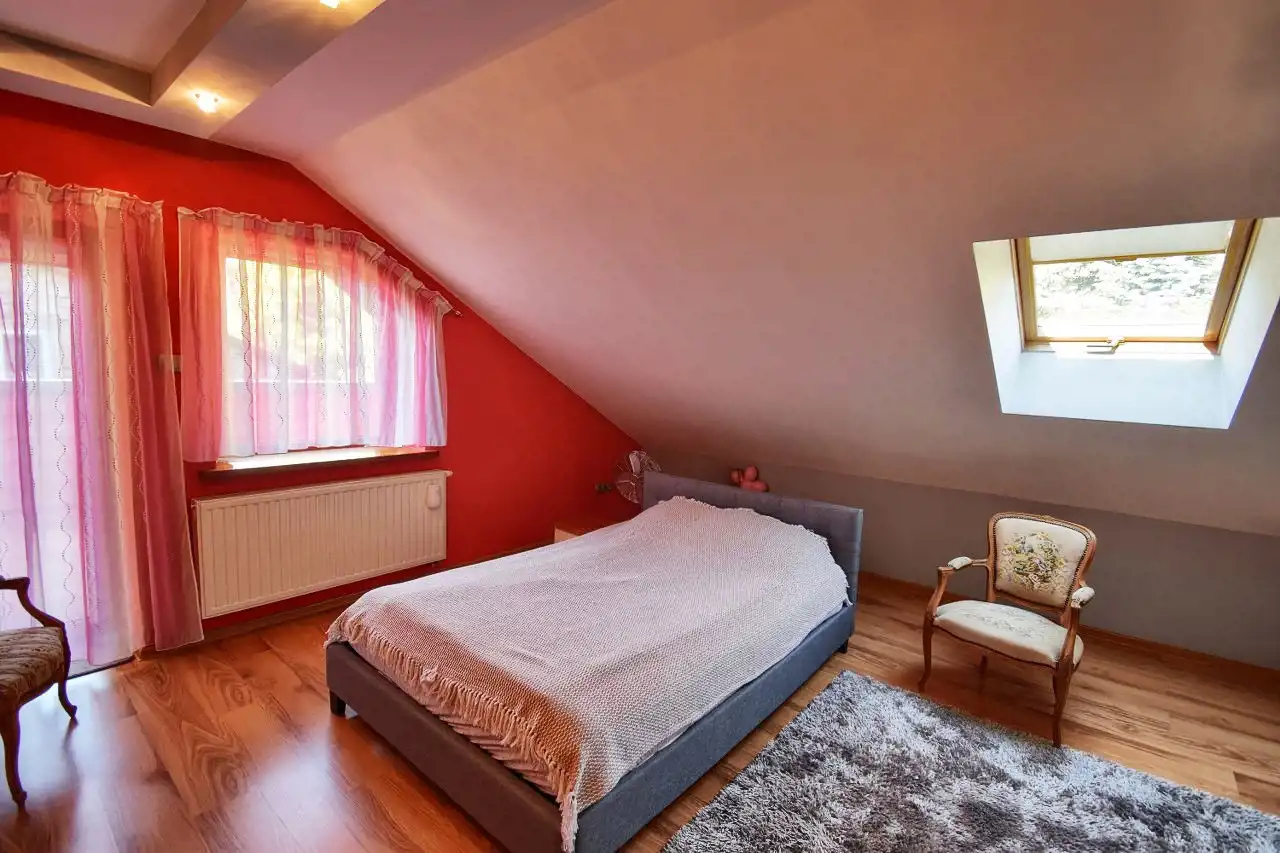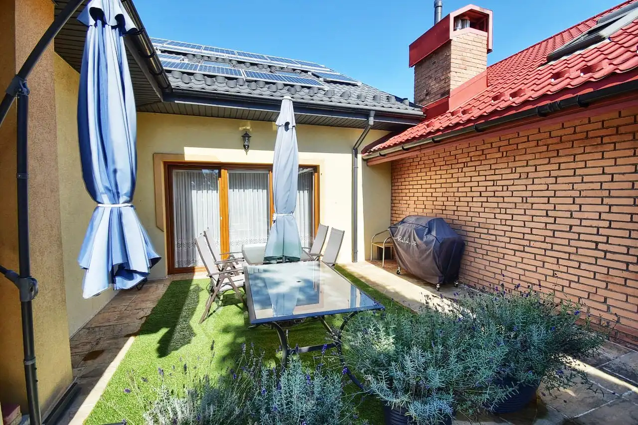 The house was built in 2007 with a usable attic. It is covered with sheet metal roofing, partially basement with a two-car garage integrated into the house. PVC windows. Heating and hot water are provided by a dual-function gas furnace. The entrance gate and garage door are operated automatically. The house is equipped with a photovoltaic installation and an alarm system.