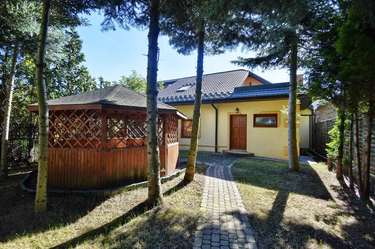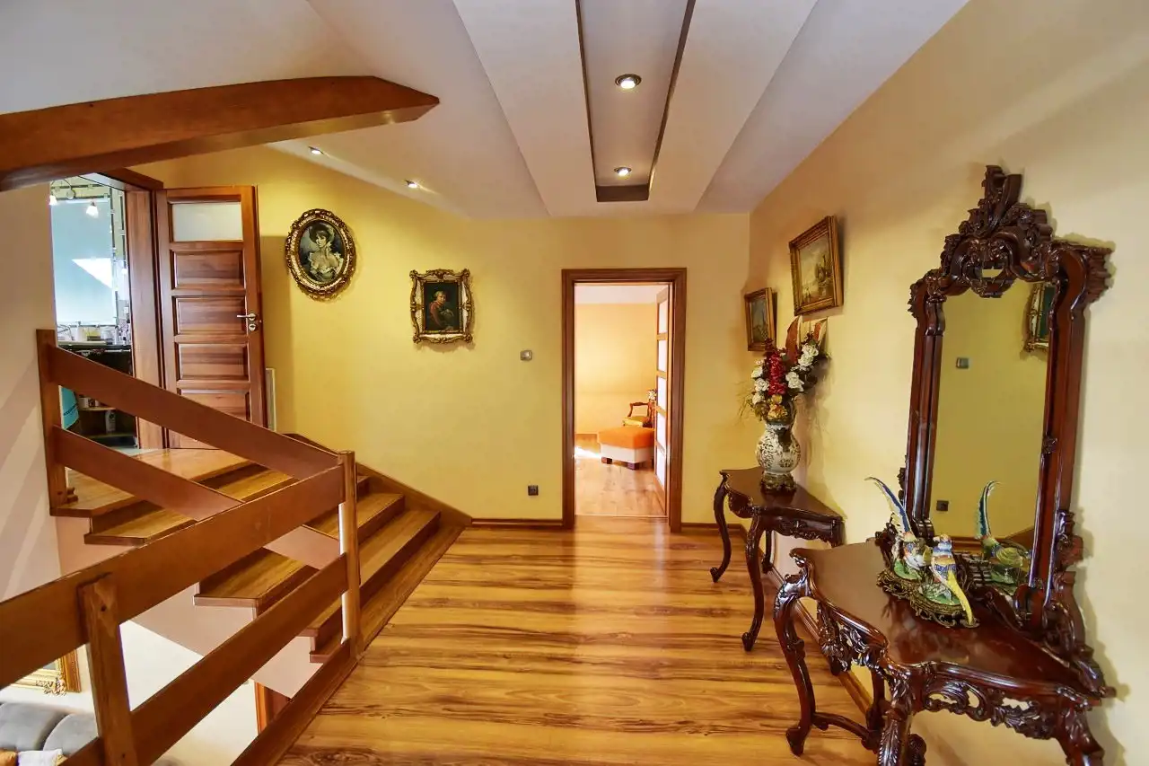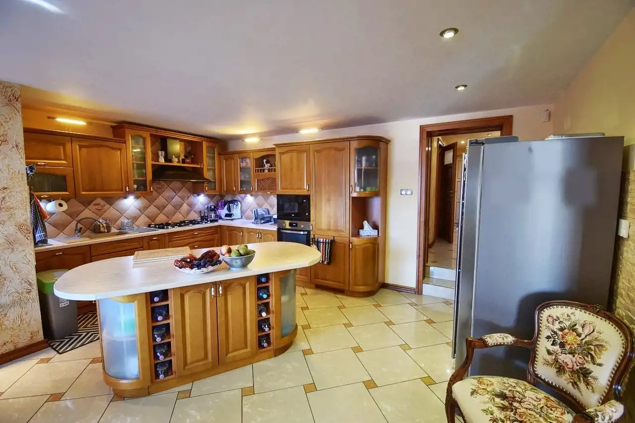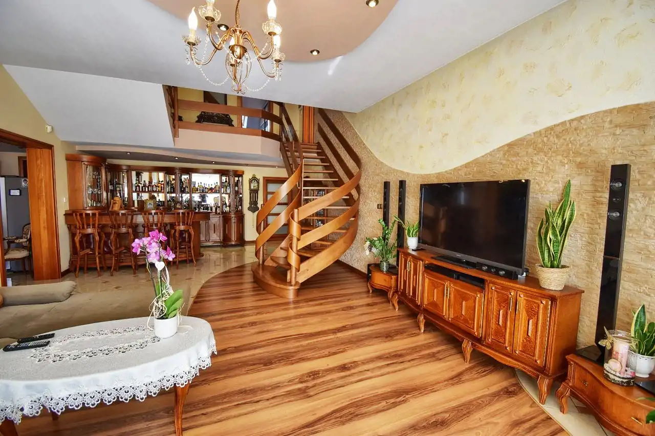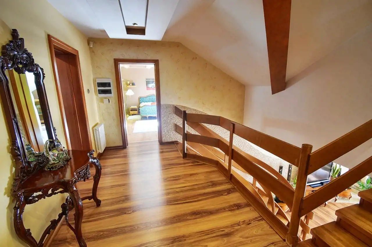 This spacious, comfortable house is finished with high-quality materials, including wood and stone. The interior features remarkable oak wood curved stairs, which are a unique decoration of the house. Most of the furniture is custom-made from oak wood. The house is located in a quiet, peaceful area in a small residential community surrounded by single-family homes. The property is fenced and well-landscaped with mature plantings, and the driveway to the garage is paved with cobblestones. In front of the house, there is a terrace with a built-in grill, and behind the house, there is a gazebo.