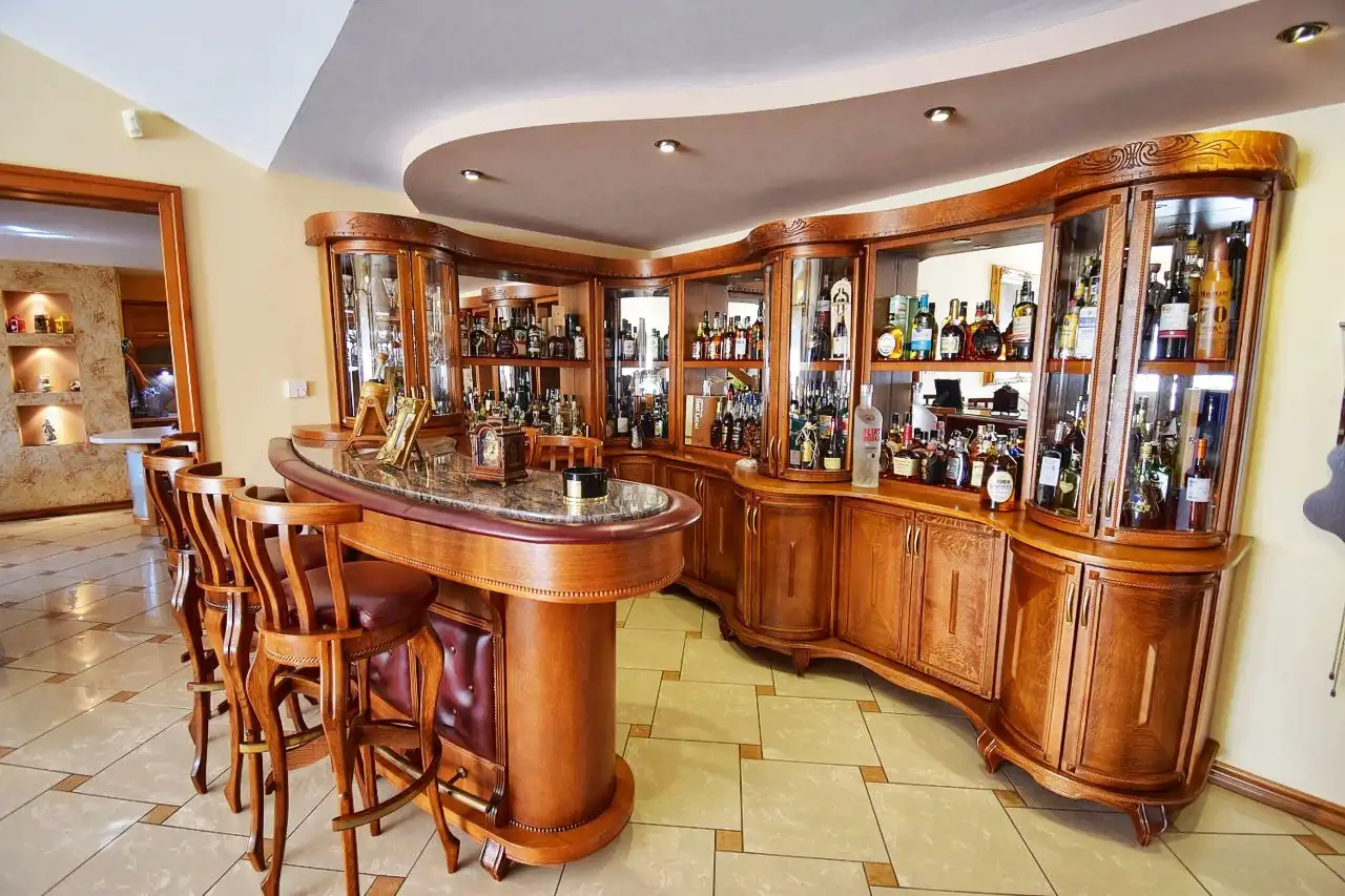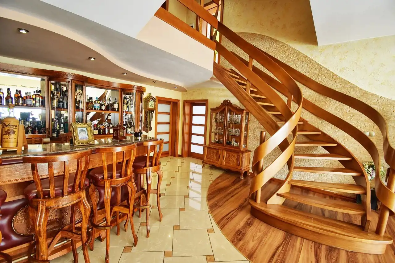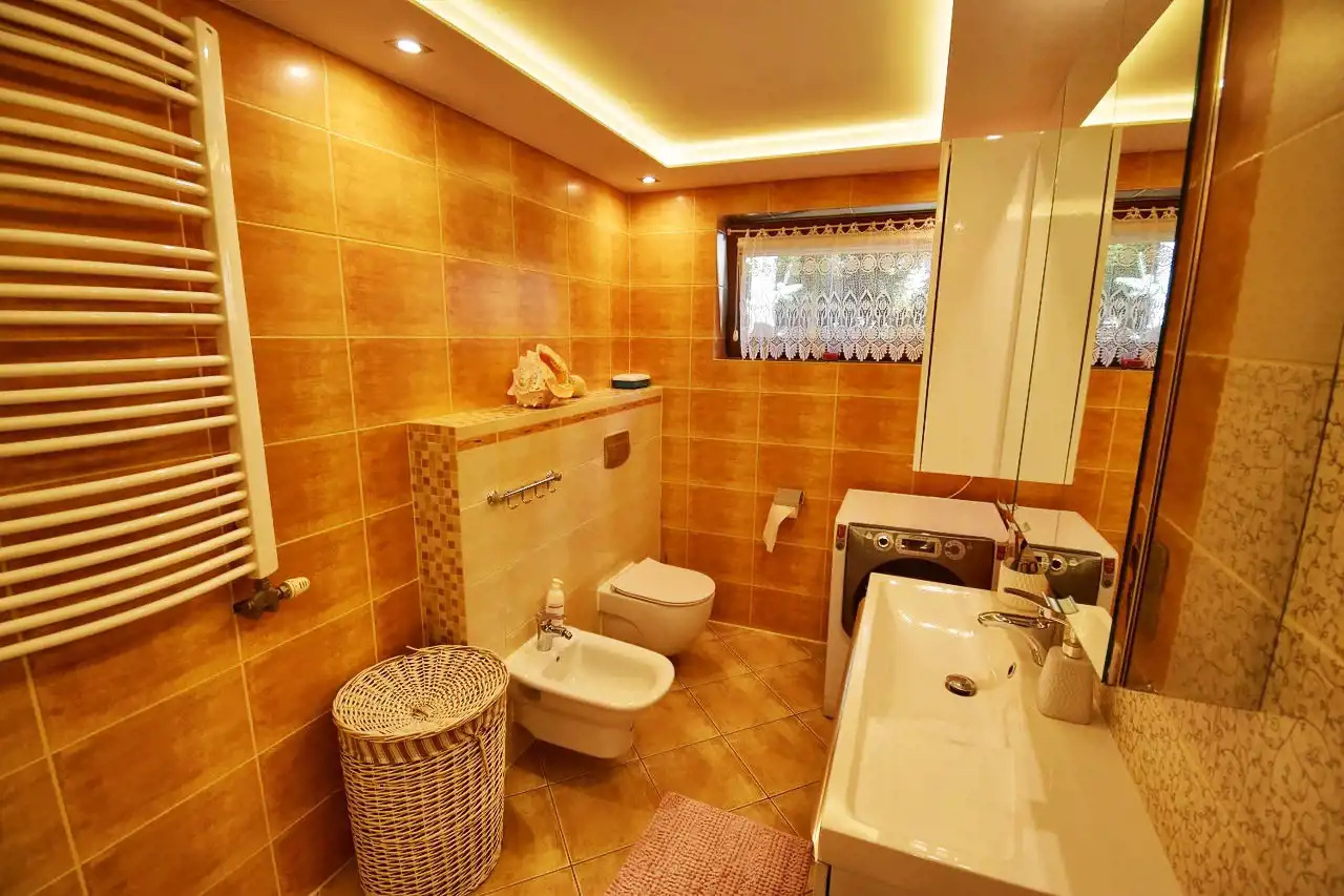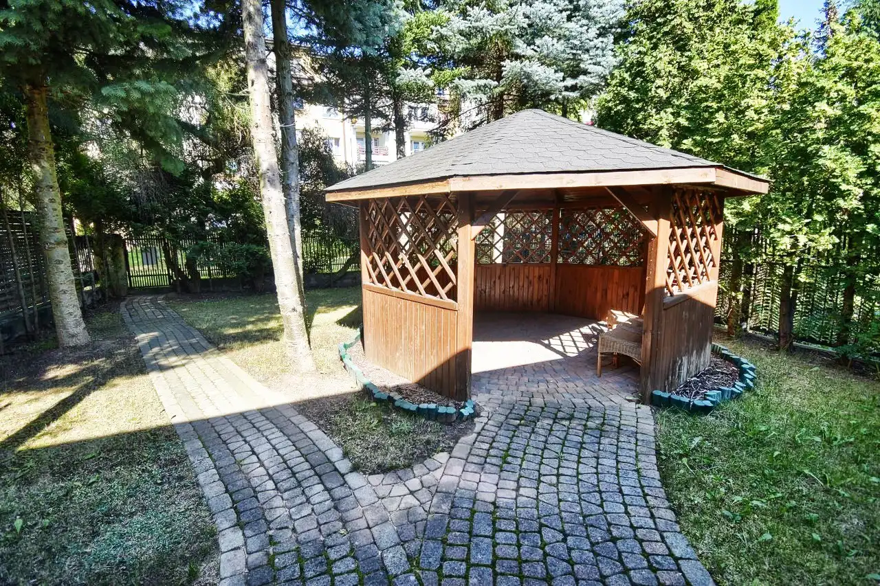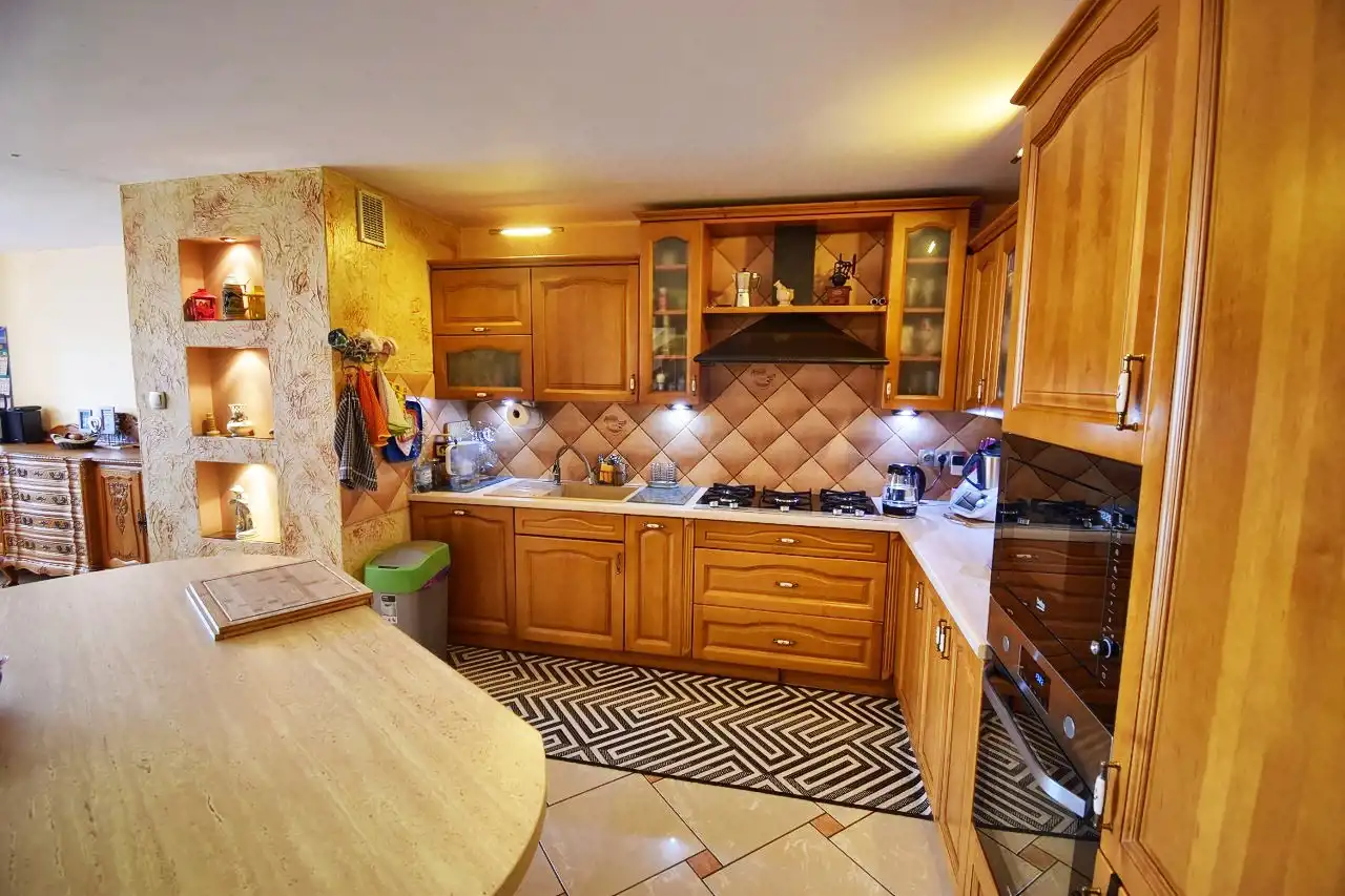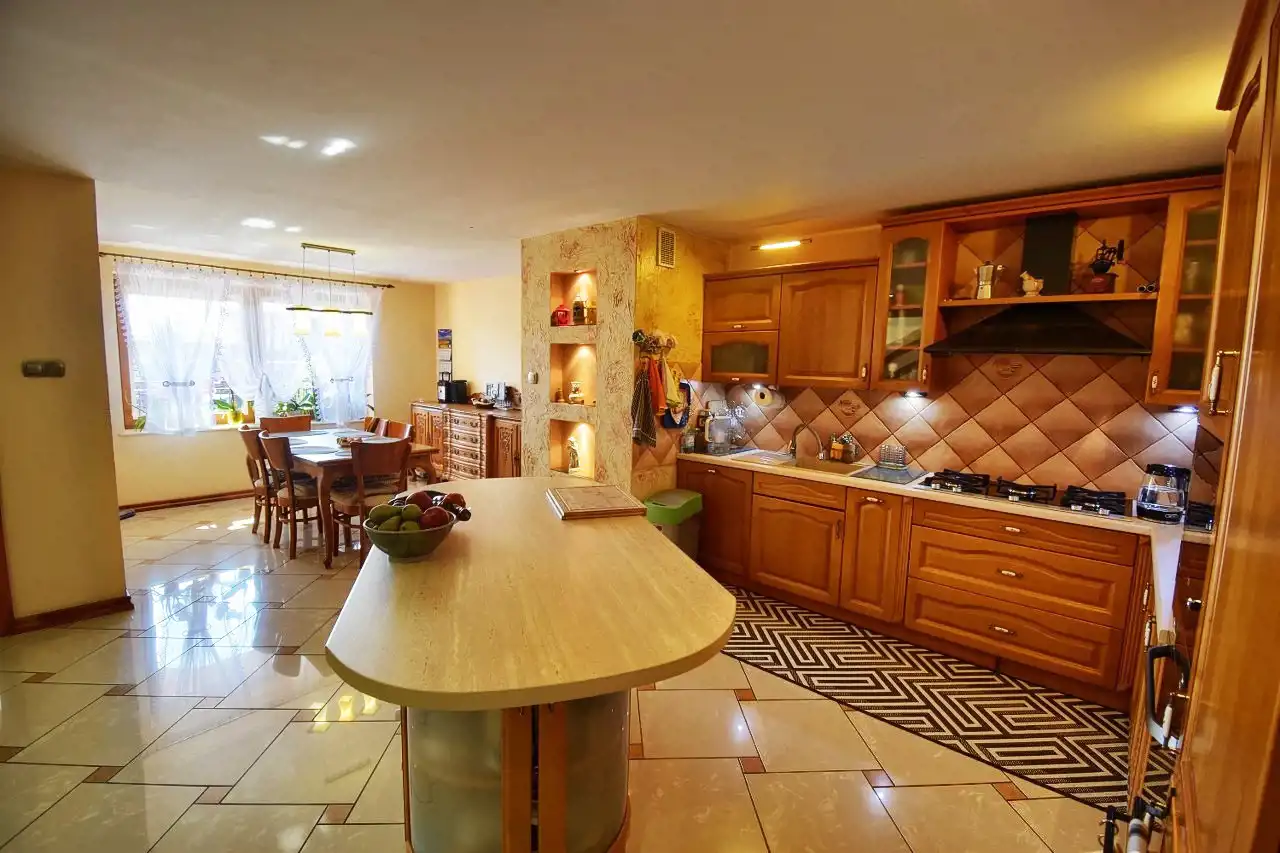 This spacious, comfortable house is finished with high-quality materials, including wood and stone. The interior features remarkable oak wood curved stairs, which are a unique decoration of the house. Most of the furniture is custom-made from oak wood. The house is located in a quiet, peaceful area in a small residential community surrounded by single-family homes. The property is fenced and well-landscaped with mature plantings, and the driveway to the garage is paved with cobblestones. In front of the house, there is a terrace with a built-in grill, and behind the house, there is a gazebo.