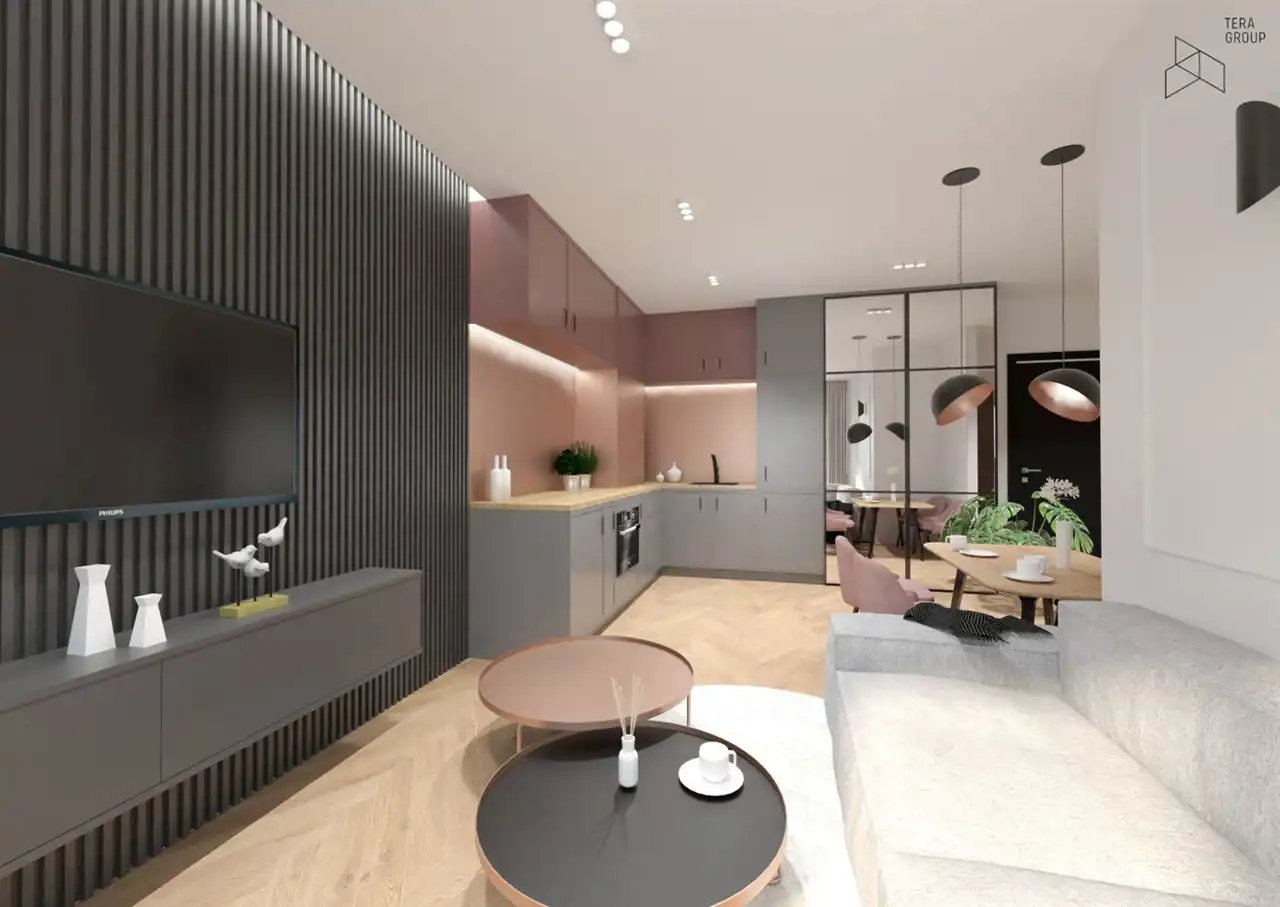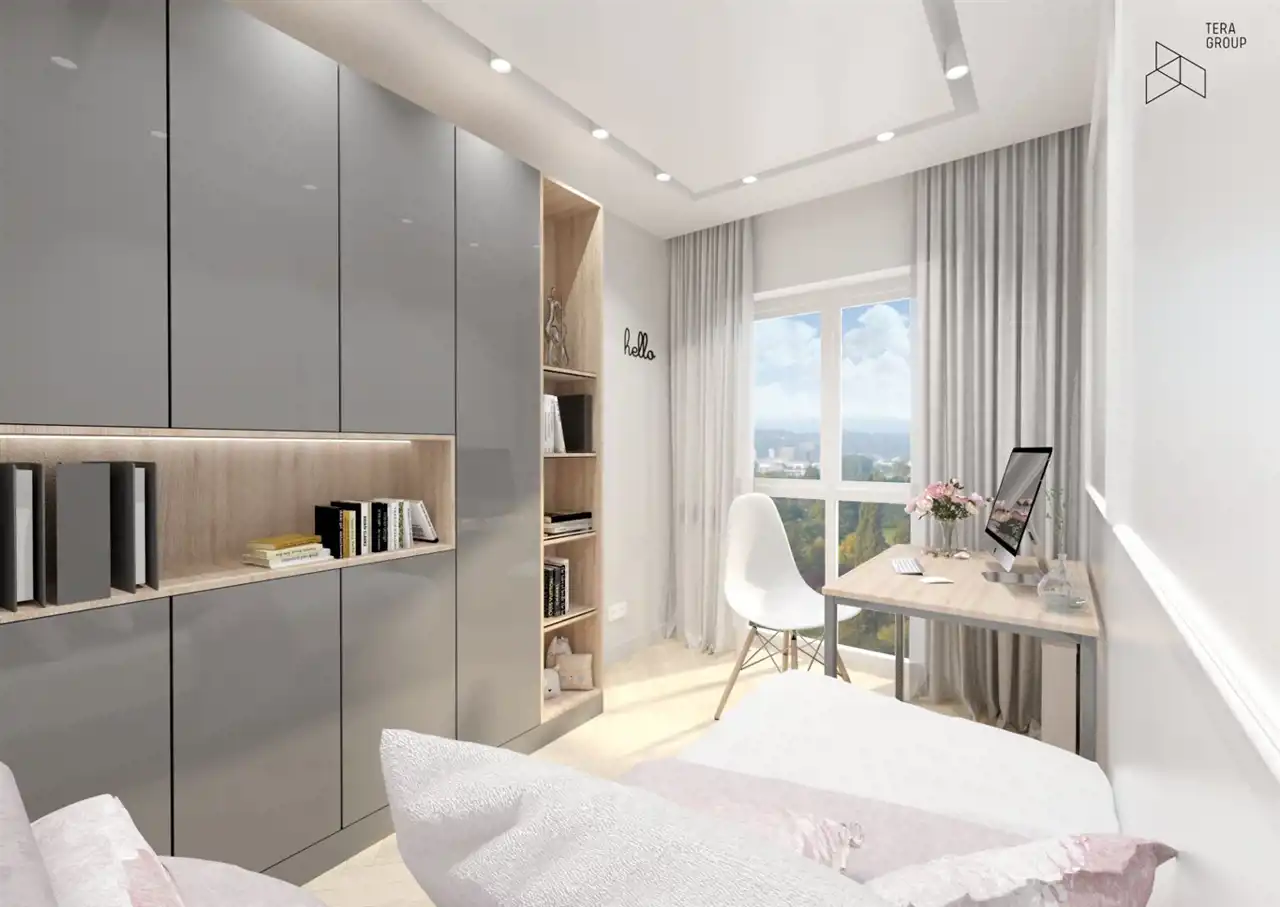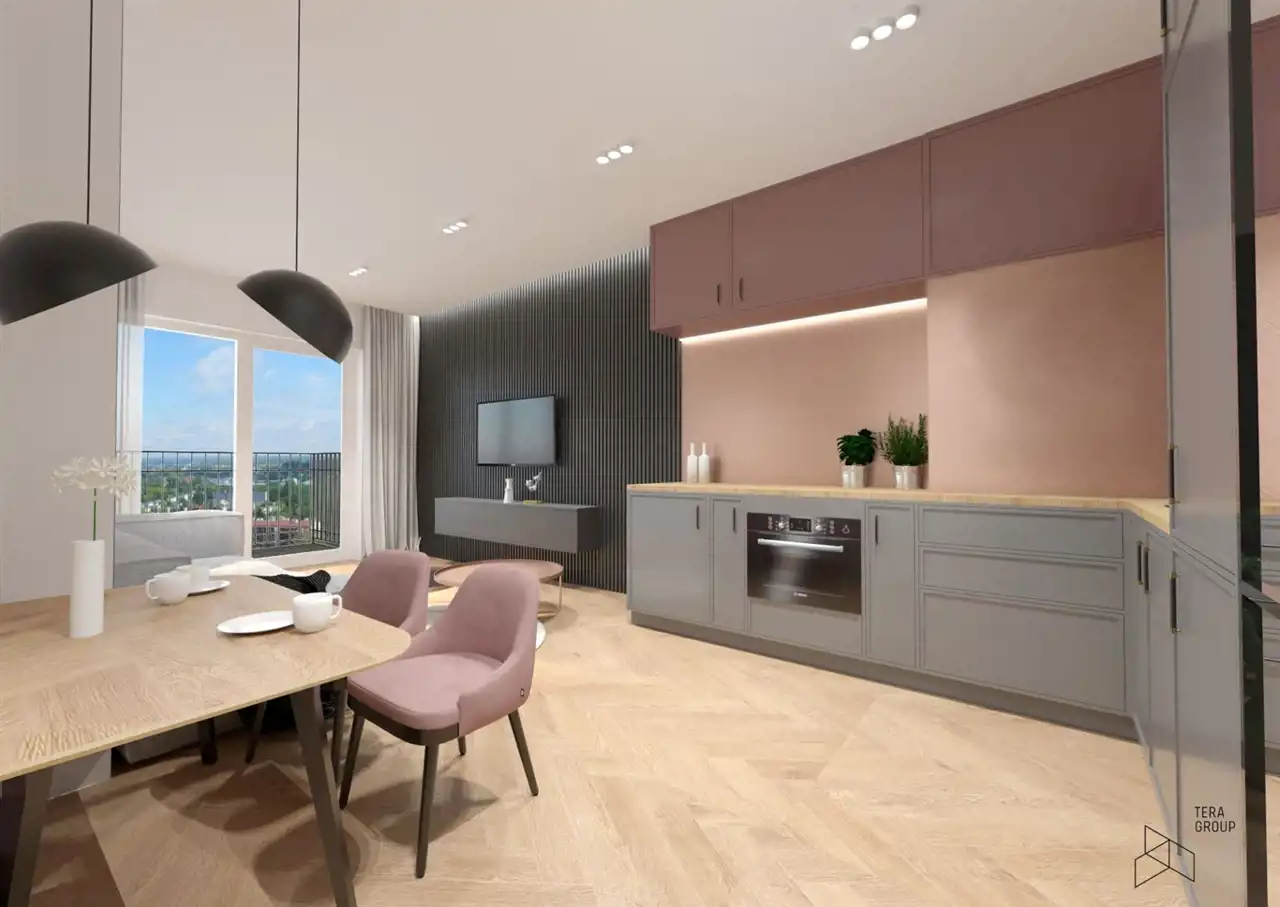 Mieszkanie narożne na pierwszym piętrze charakteryzujące się trzeba balkonami oraz dwiema łazienkami. Mniejsza łazienka przylega do salonu z aneksem kuchennym z którego jest możliwość wyjścia na południowy balkon. Każda z trzech sypialni ma możliwość wyjścia na balkon.
