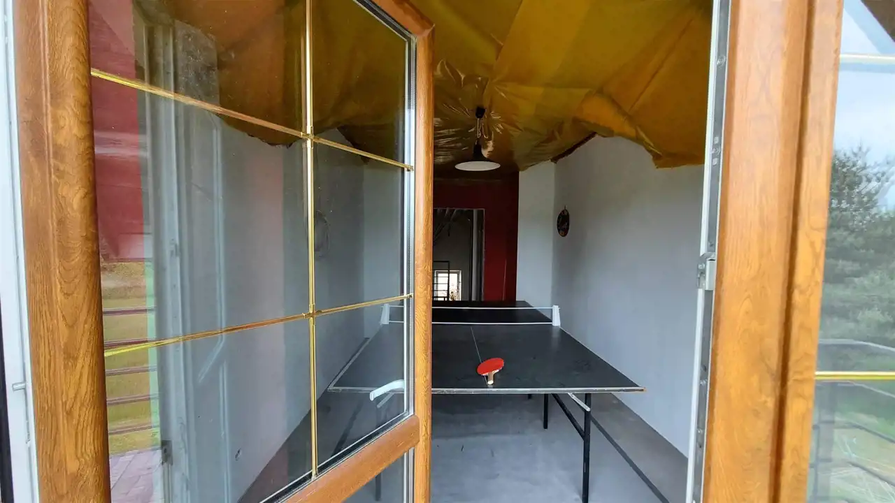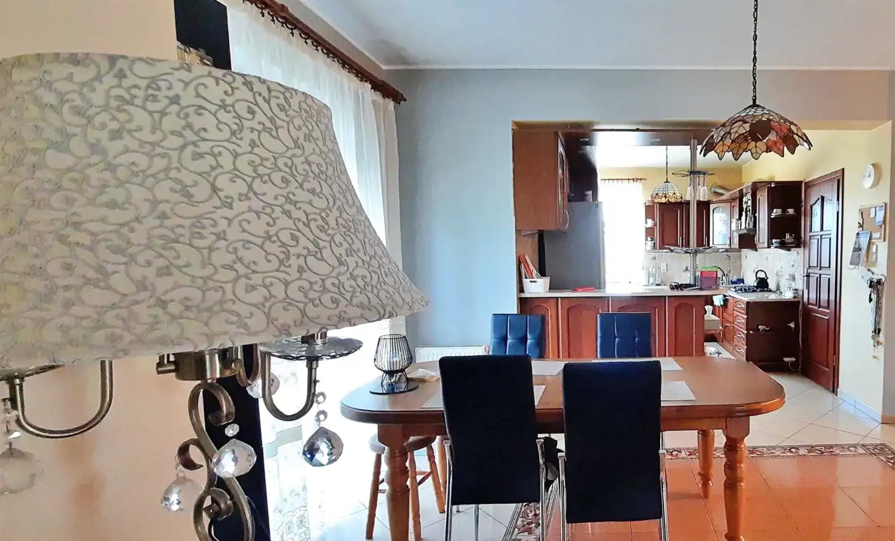- W skład nieruchomość wchodzi: - parter: wiatrołap, przestronny hol, pomieszczenie gospodarcze / kuchnia z jadalnią /salon z kominkiem, pokój dziecięcy, łazienka, kotłownia, pralnia. Parter wykończony i zadbany. Kuchnia w pełni wyposażona i umeblowana. W salonie kominek. Z części jadalnej jak i z salonu jest wyjście na taras. Na parterze znajduje się również łazienka połączona z wc, pokój dziecięcy, kotłownia oraz pralnia. Na dole można wydzielić dodatkową sypialnię zyskując tym dwa pokoje ale pozostawiając nadal salon połączony z jadalnią i kominkiem.