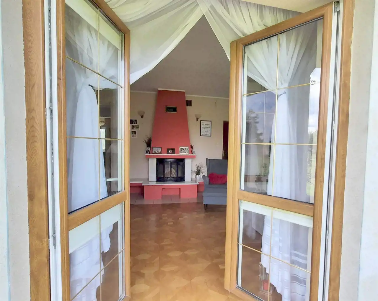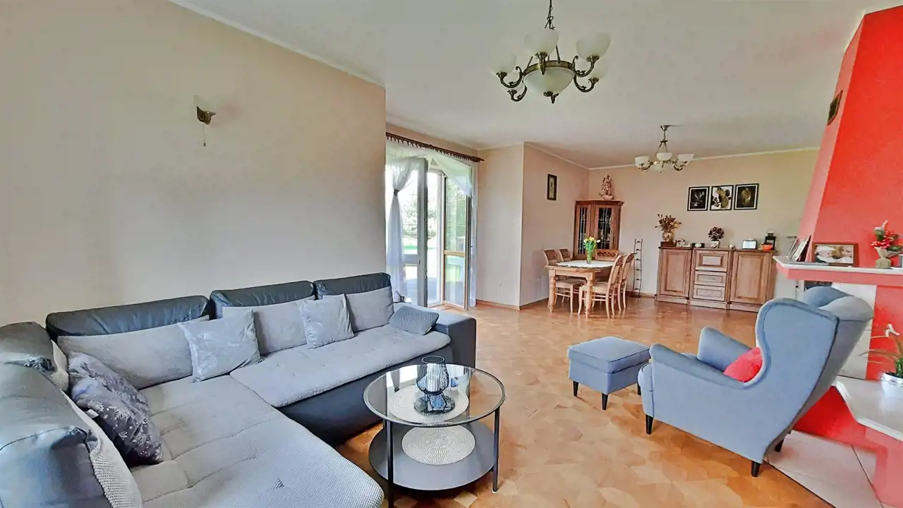 - przestronny dobrze doświetlony, z salon z kominkiem, z którego mamy bezpośrednie wyjścia na dwa tarasy i ogród.