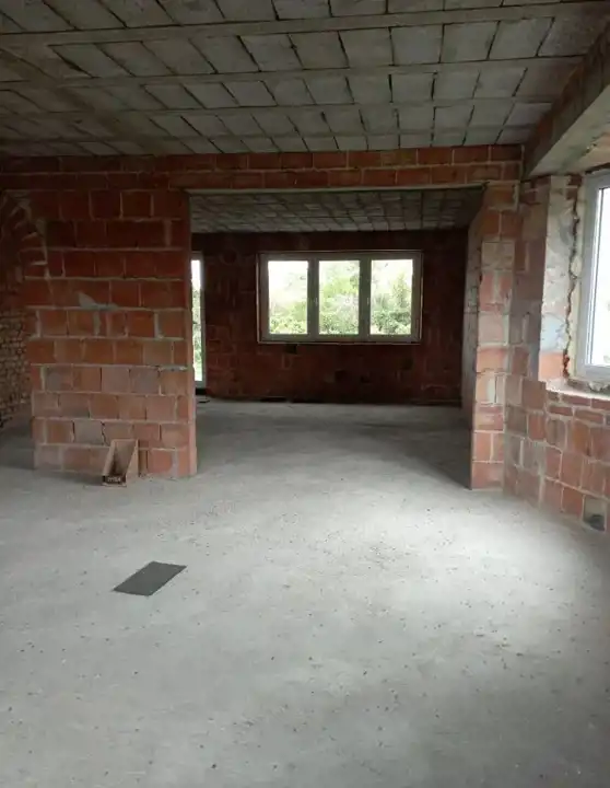 Dom jest do wykończenia: tynki, podłogi, instalacje wewnętrzne.