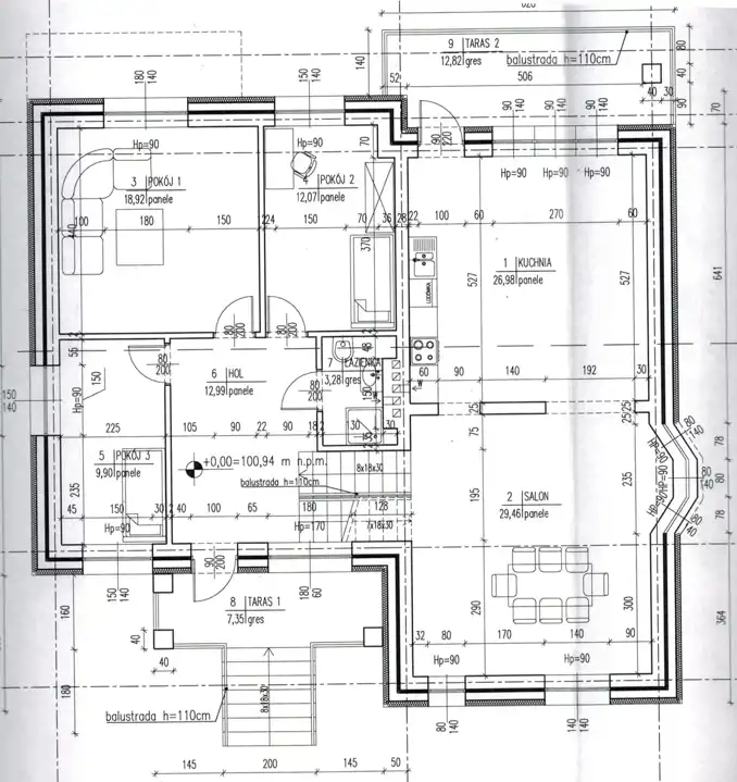 PARTER: salon (29,46 m2), połączony z kuchnią (26,98 m2), łazienka (3,28 m2), hol (12,99 m2), trzy pokoje (18,92 m2, 12,07 m2, 9,90 m2).
