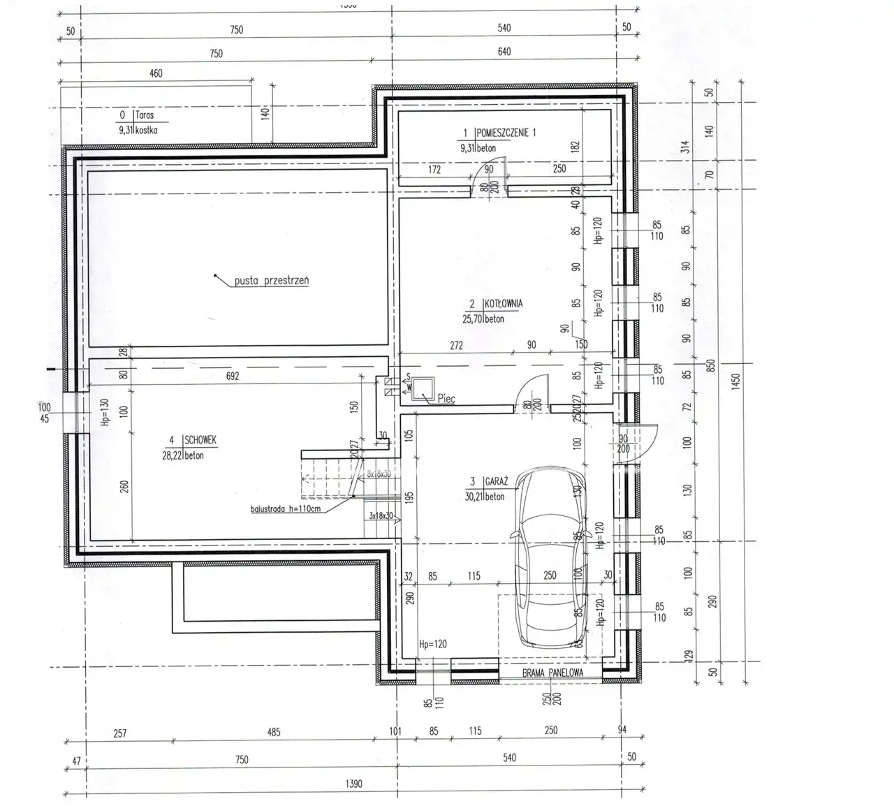 PIWNICA: garaż (30,21 m2), kotłownia (25,70 m2), schowek (28,22 m2), pomieszczenie (9,31 m2).