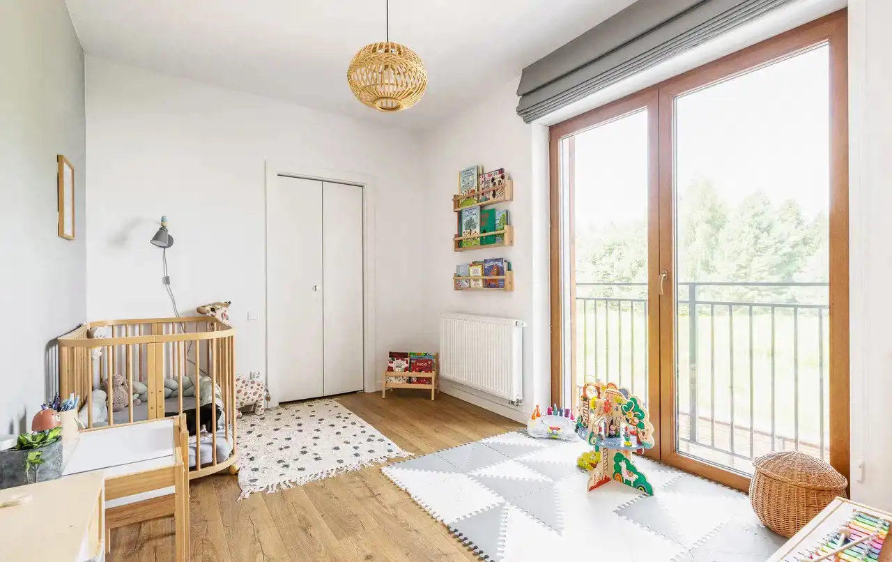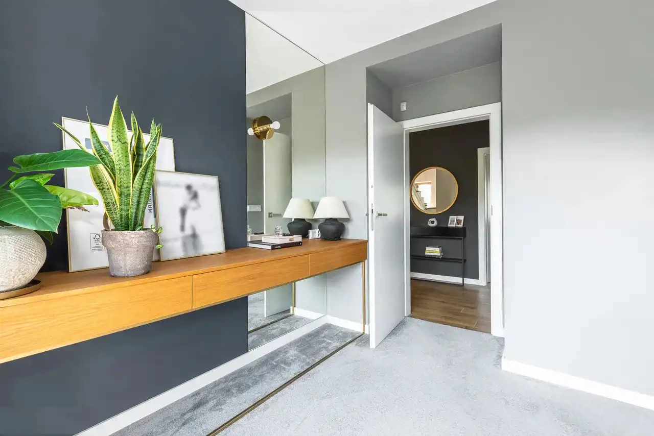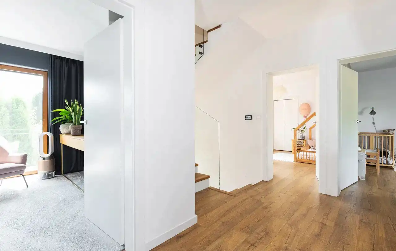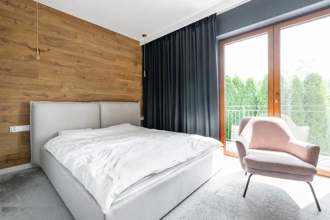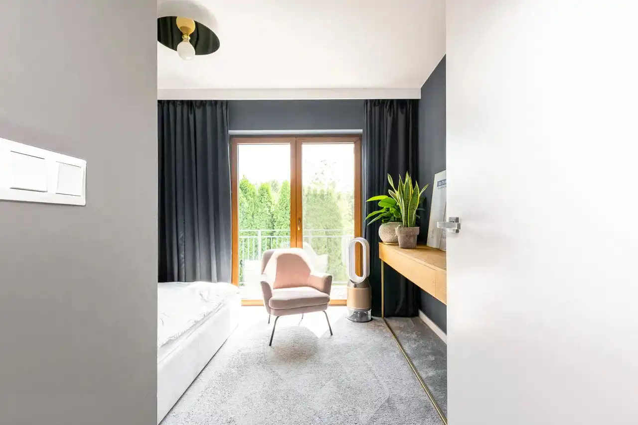 - nowoczesne wykończenie, neutralna stylistyka, duże okna,