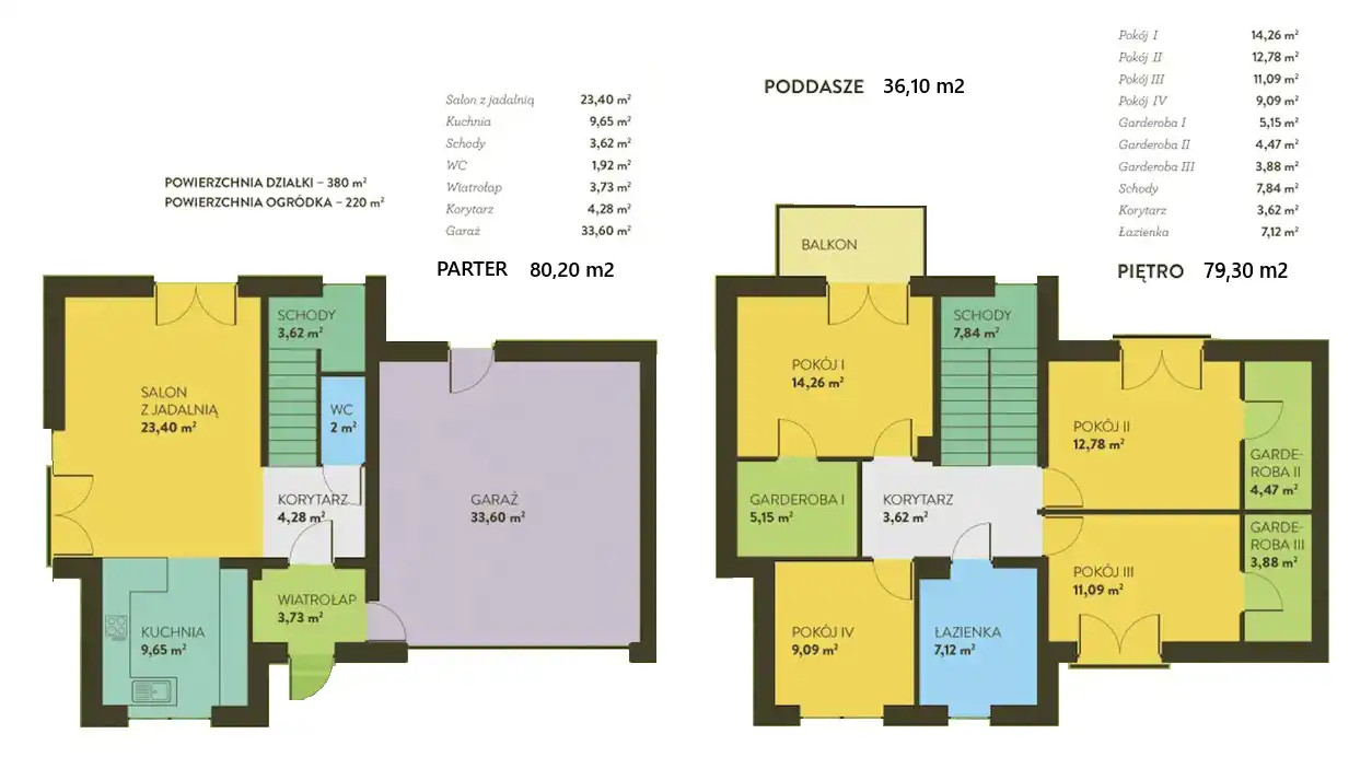 PARTER: narożny salon z jadalnią (23,40 m2), połączony z kuchnią (9,65 m2), toaleta (1,92 m2), hol (4,28 m2), wiatrołap (3,73 m2), klatka schodowa (3,62 m2), garaż na dwa samochody (33,60 m2).
