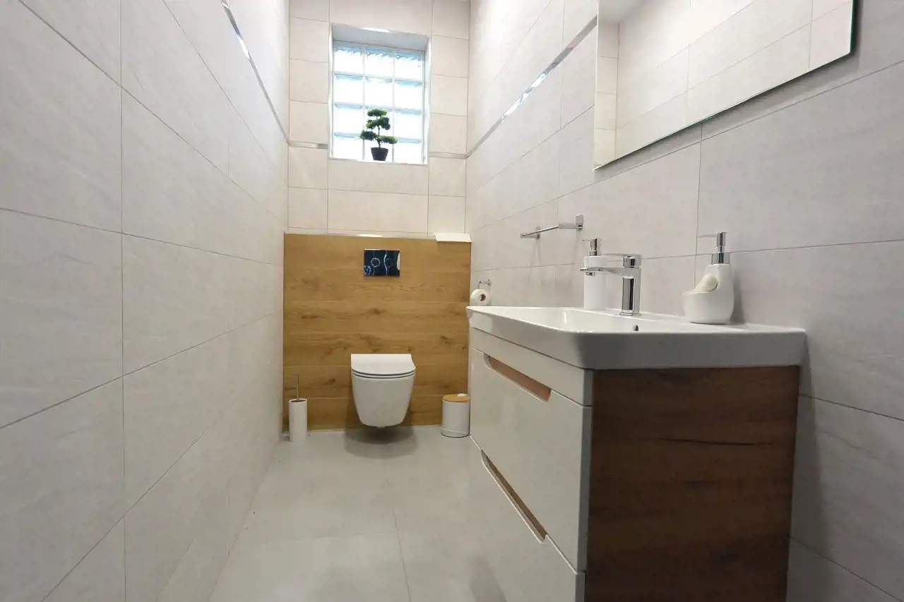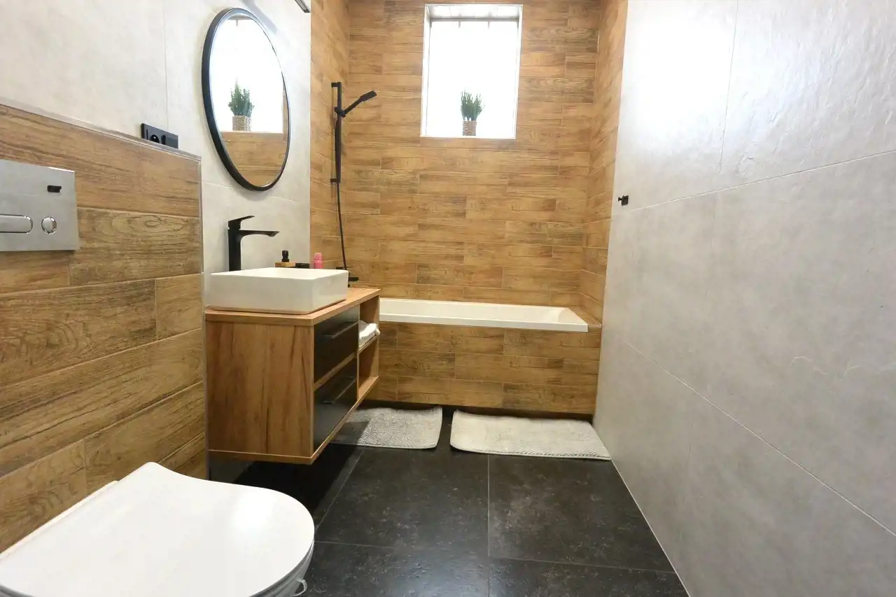 - First floor: open space, two rooms, bathroom with bathtub and WC