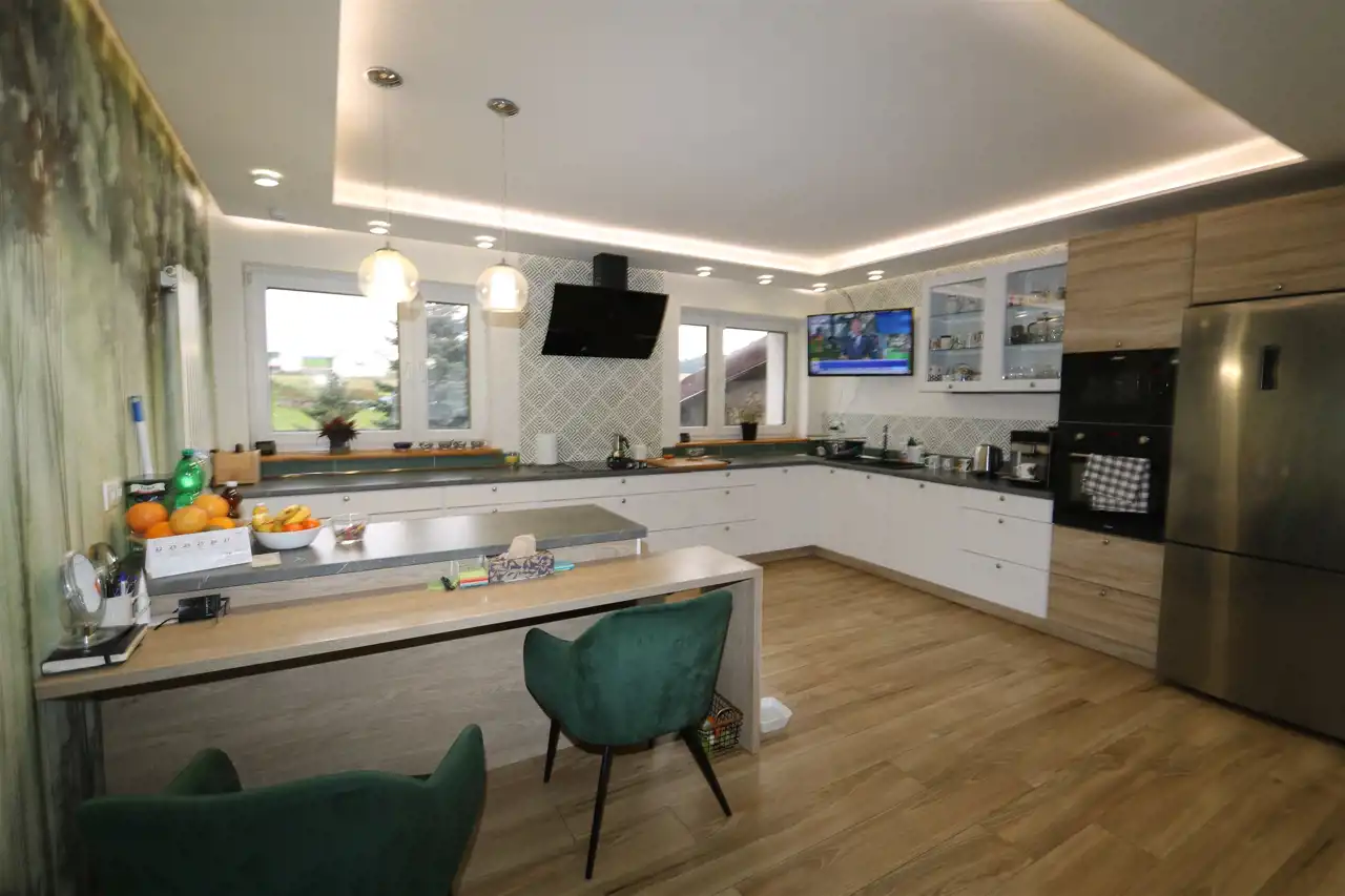 Półpiętro: kuchnia z jadalnią( ok. 50 m2) z wyjściem na balkon