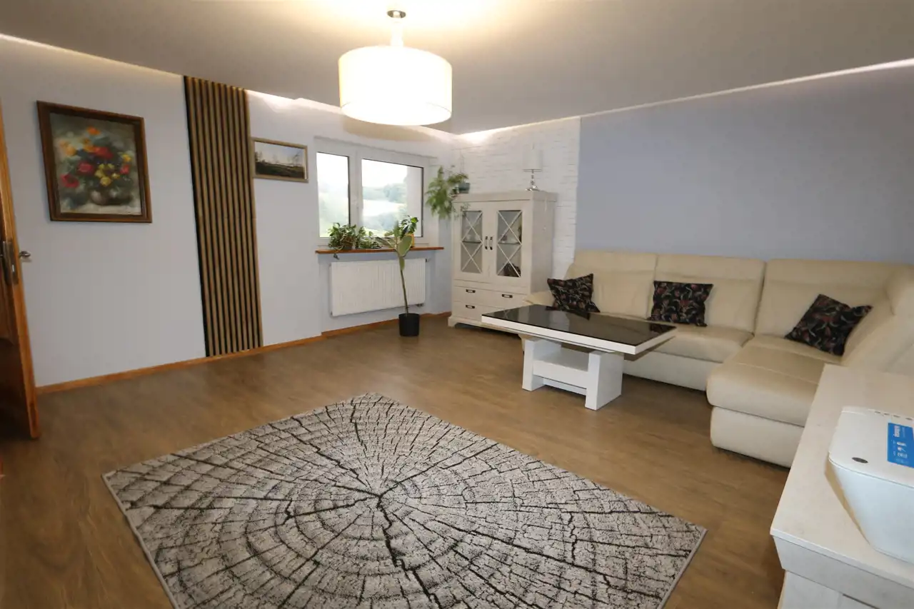 Ogrzewanie centralne - piec olejowy ze zbiornikiem 1600 l, dodatkowo w salonie i w kuchnio-jadalni ogrzewanie podłogowe na prąd.