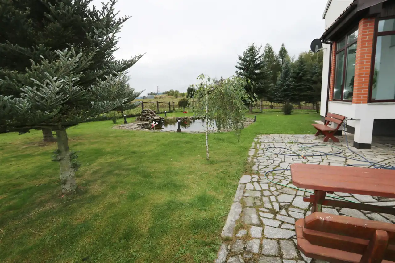 Posesja w całości ogrodzona z wybrukowanym podjazdem na kilka samochodów, brama wjazdowa na pilota, w ogrodzie oczko wodne, trawa, drzewa.