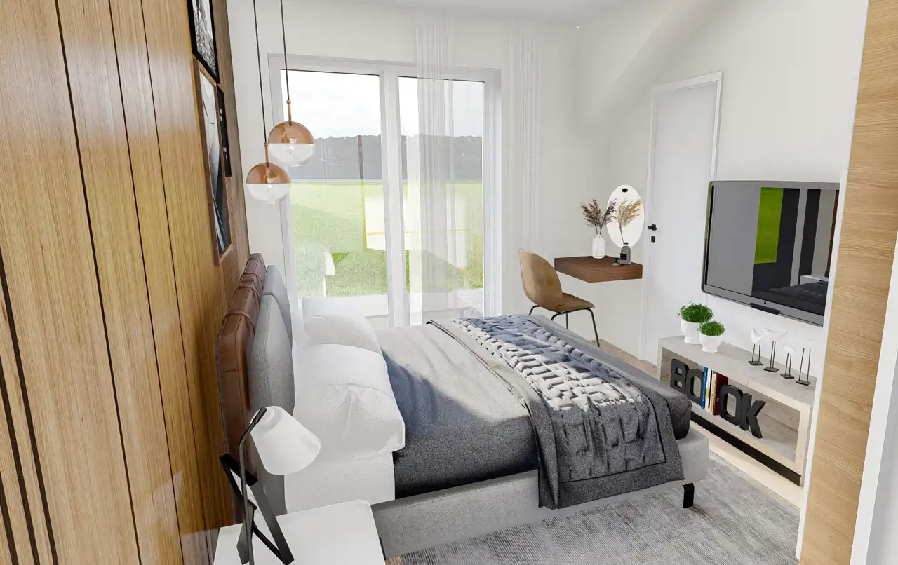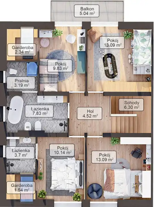 2 Sypialni o łącznej powierzchni z możliwością wyjścia na balkon: 13,09m2 oraz 9,83m2
