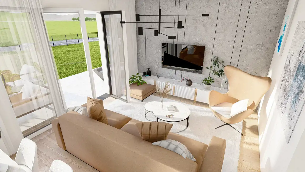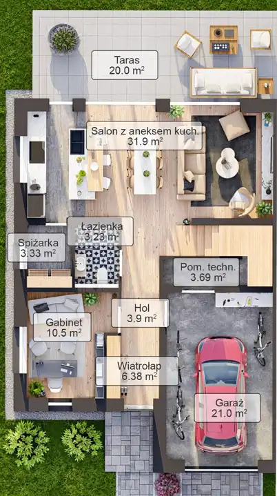 Salonu z aneksem kuchennym z możliwością wyjścia na taras i ogród: 31.9m2