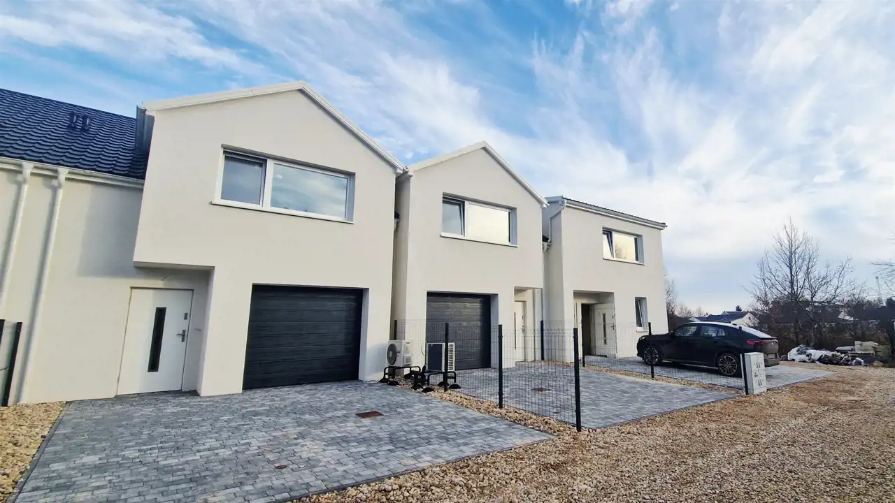 Budynki wykonane w technologii energooszczędnej z bloczków gazobetonowych Solbet, ocieplone 15 cm warstwą grafitowego styropianu i wykończone białym tynkiem silikonowym.