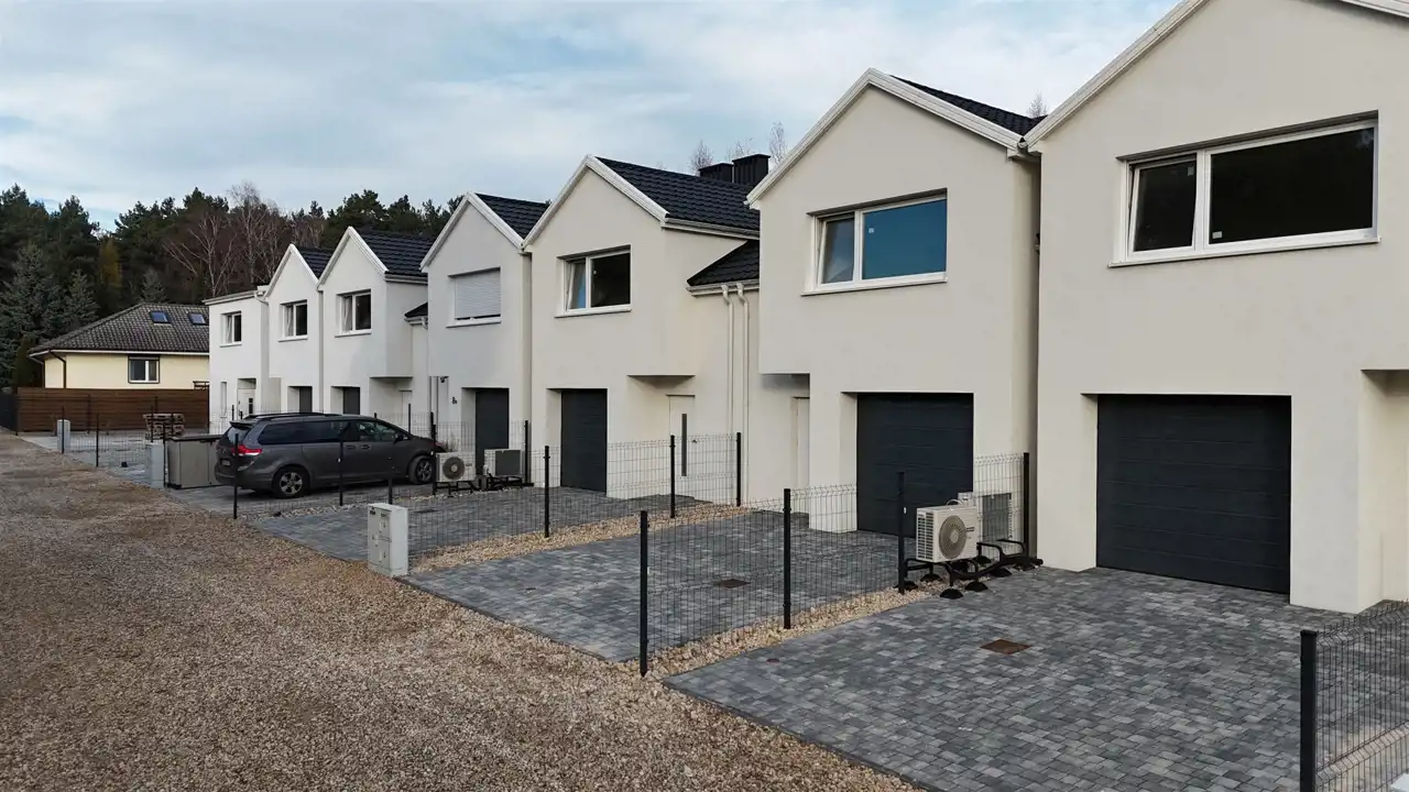 Działki są ogrodzone i wybrukowane, z doprowadzonymi wszystkimi mediami: kanalizacją, wodą oraz energią elektryczną. Ogrzewanie podłogowe w całym budynku zasilane pompą ciepła.