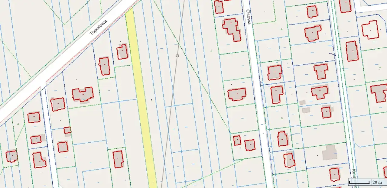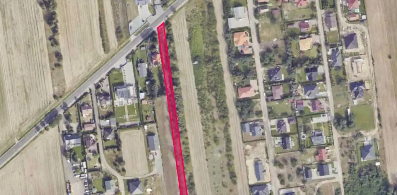 Działka o regularnym kształcie (prostokąt) i wymiarach 9.7m x309m. Wszystkie podstawowe media jak i infrastruktura dostępne są bezpośrednio w drodze (prąd, woda, kanalizacja, światłowód).