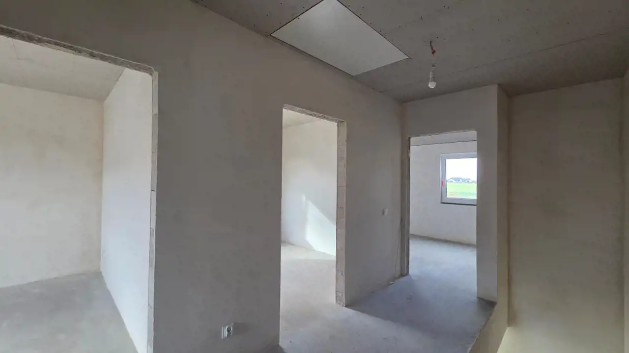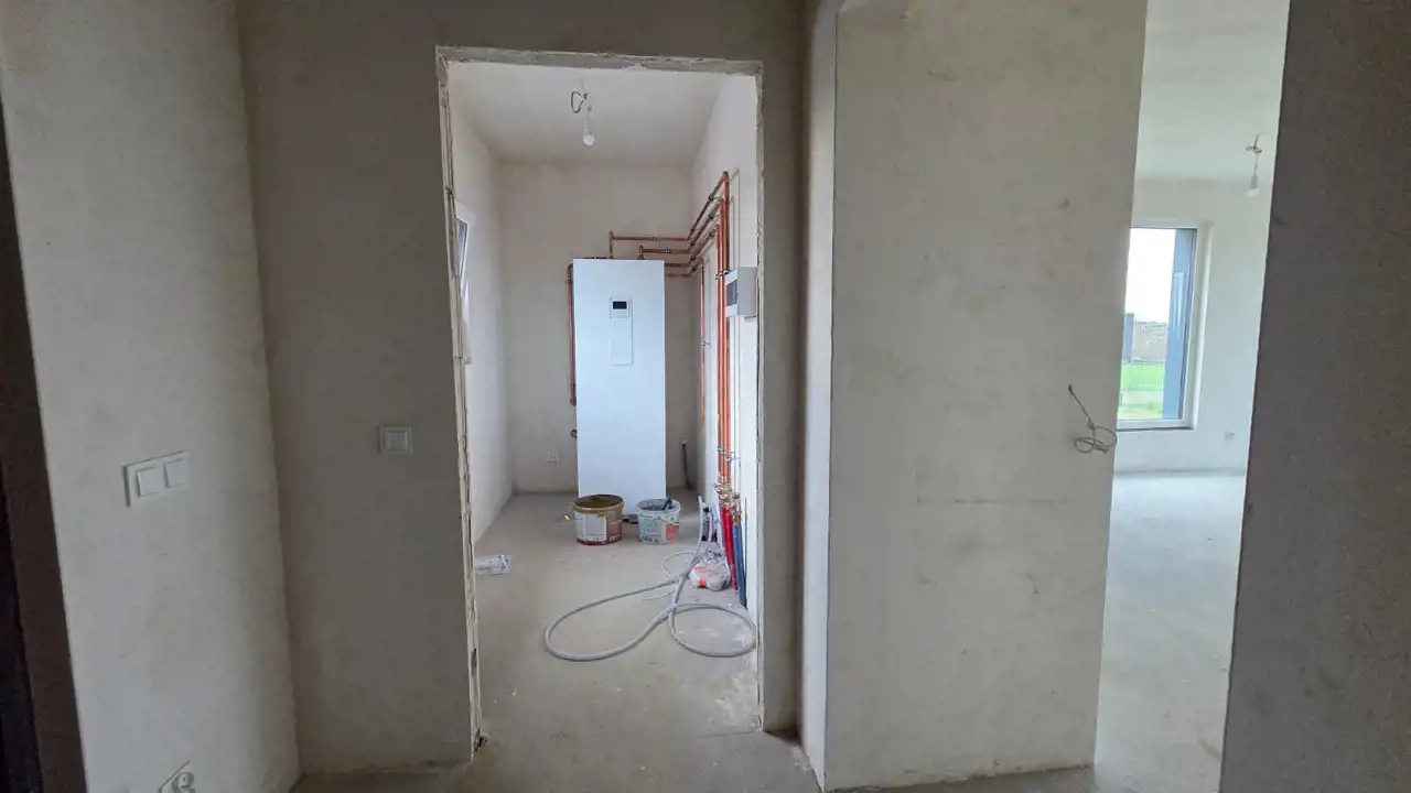 Dom został wykonany w wysokim standardzie deweloperskim, z dużym naciskiem na energooszczędność. Ogrzewanie podłogowe w całym budynku, nowoczesna pompa ciepła Samsung z zasobnikiem ciepłej wody oraz bardzo dobre parametry izolacyjne zapewniają niskie koszty eksploatacji. Dodatkowym atutem jest przygotowane przyłącze pod kominek w salonie.