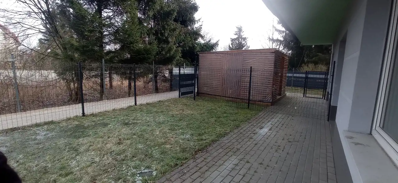 Do mieszkania przynależy taras 14,06 m2, płynnie przechodzący w ogródek 28,12m2 . Całość gruntu na zewnątrz, 42,18 m2, ogrodzono panelami siatkowymi.