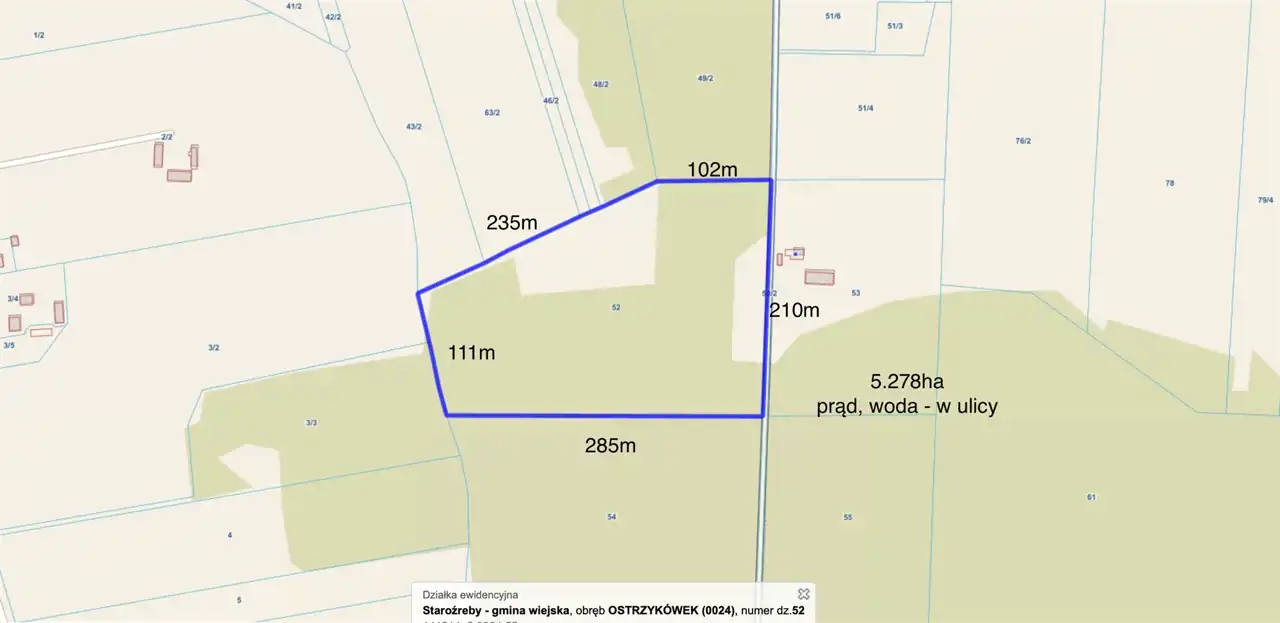 - Media Woda: w ulicy; Kanalizacja: brak; Prąd: w ulicy; Gaz: brak