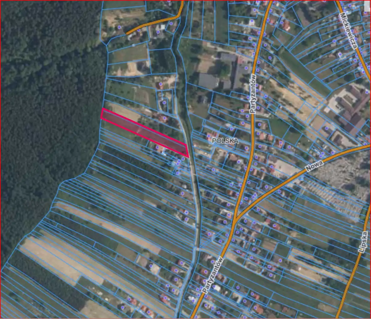 Działka w rejonie ulicy Partyzantów i Parkowej, przylegająca do kompleksu leśnego. Teren objęty miejscowym planem zagospodarowania przestrzennego, o oznaczeniu 8.MN - tereny zabudowy mieszkaniowej jednorodzinnej oraz 1.RP - teren rolny bez prawa zabudowy z uwagi na ochronę ekspozycji zespołu staromiejskiego.