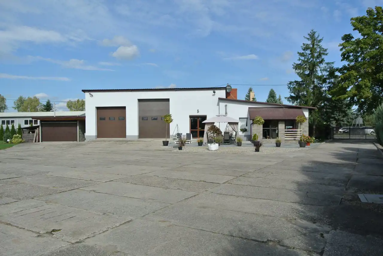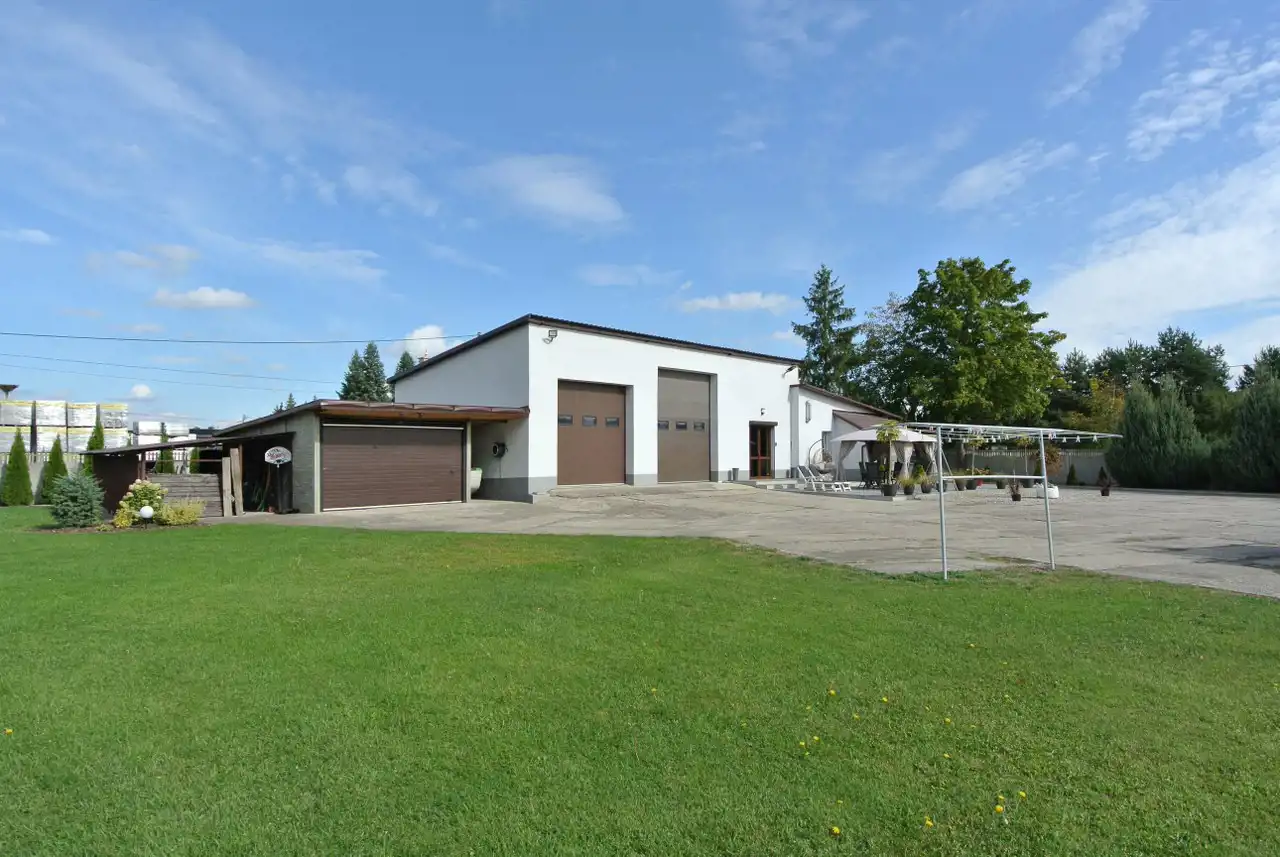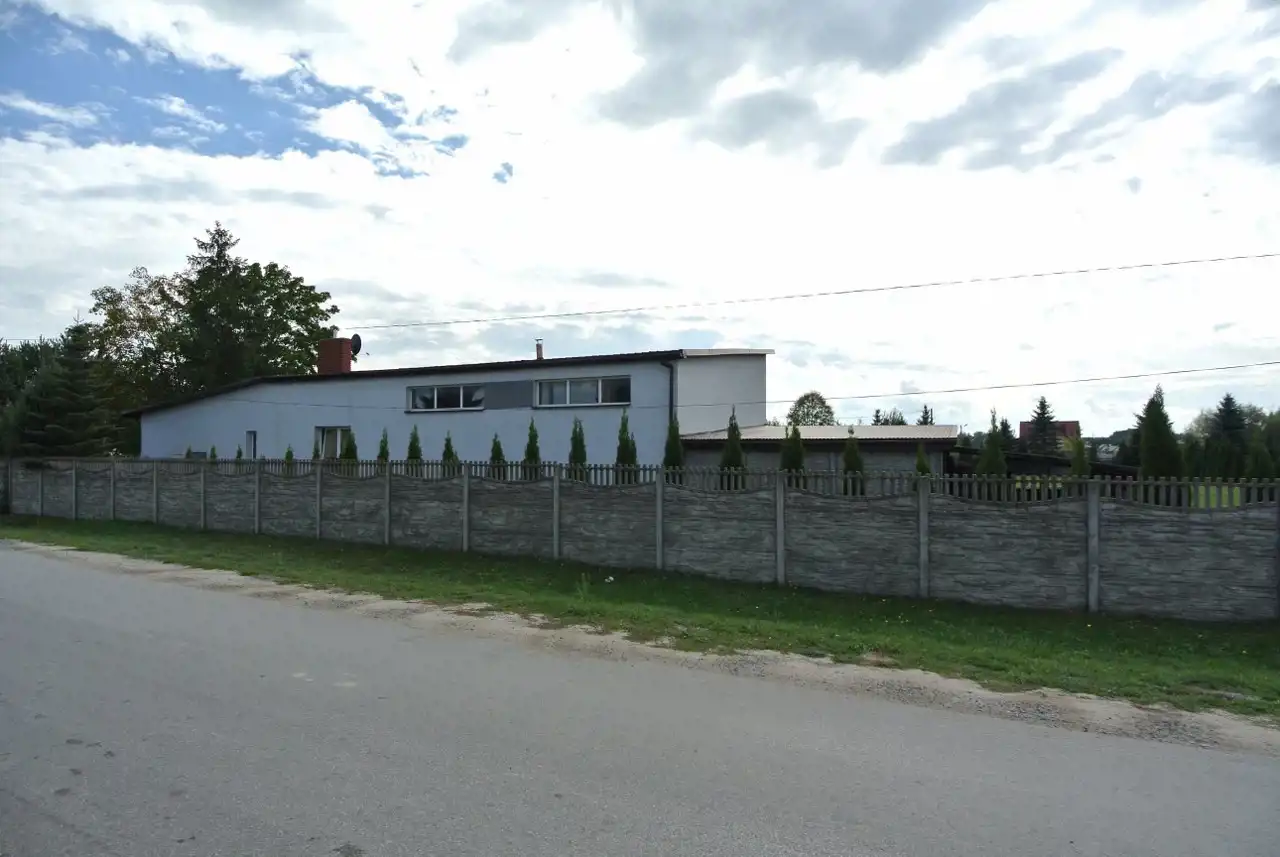 Na działce znajduje się budynek (hala) o powierzchni ok. 160 m2 z częścią mieszkalną, biurową, pokojami, łazienką, kuchnią i przedpokojem, hala z 2 bramami wjazdowymi. Dodatkowo dostępny jest lokal o pow. ok. 70 m2 o charakterze magazynowym z trzema pomieszczeniami. Budynki wybudowane z pustaka i cegły, pokryte blachą.