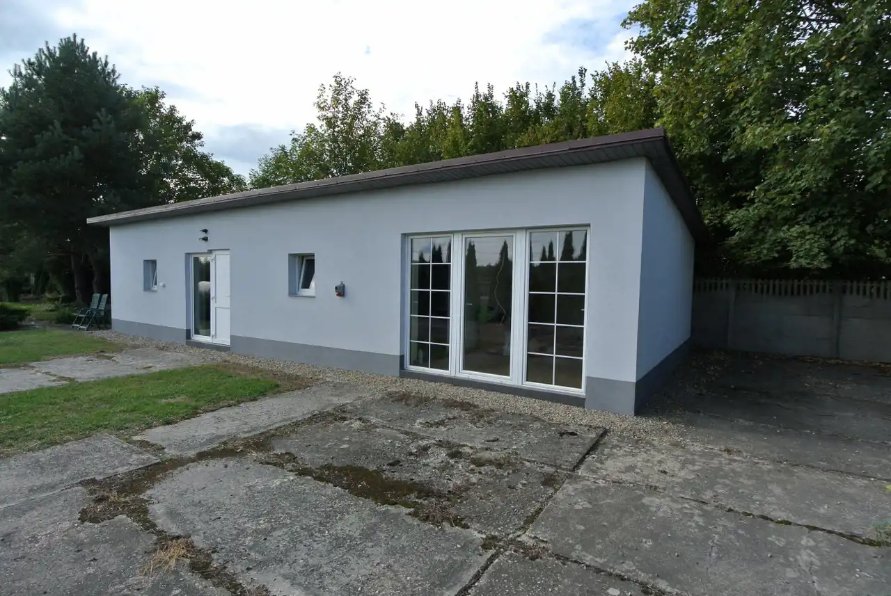 On the plot, there is a building (hall) with a surface area of approximately 160 m², including a residential section, office space, rooms, bathroom, kitchen, and hallway, as well as a hall with two entrance gates. Additionally, there is a storage facility of around 70 m², comprising three rooms. The buildings are constructed of concrete blocks and bricks, covered with metal sheeting.