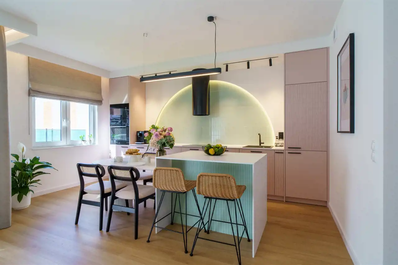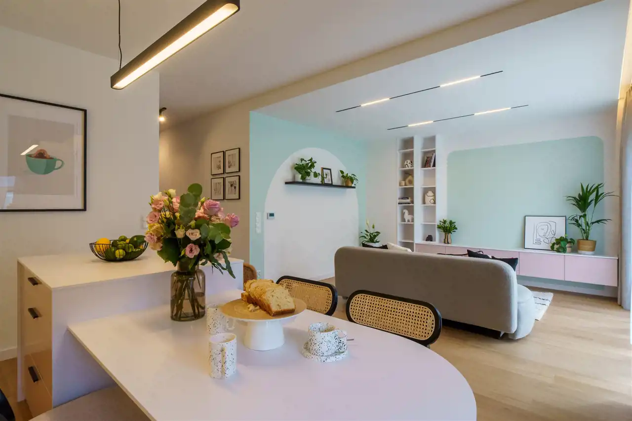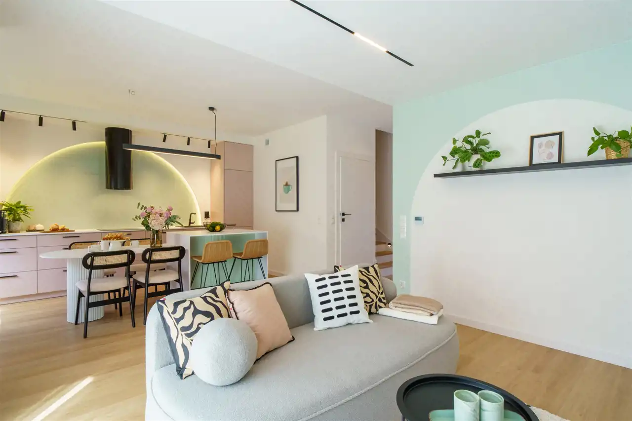 Część mieszkalna to koncepcja była zainspirowana nietuzinkową osobowością właścicieli, którzy nie bali się kolorów. W nowoczesnym wnętrzu miały pojawić się kolory pastelowe połączonymi czarnymi dodatkami oraz tonującymi szarościami i chłodnymi beżami. Dużą wagę zostało przywiązane do instalacji elektrycznej oraz do wyboru źródeł światła - ogólnie zależało na stworzeniu światłem ciepła i klimatu stąd różne strefy oświetlenia, wysokiej jakości systemy szynowe wraz z reflektorami. Na parterze wejście prowadzi bezpośrednio przez wiatrołap, a następnie po prawej stronie znajduje się pomieszczenie z głębokimi szafami na wymiar oraz po lewej stronie garaż o powierzchni 18,3 m2. W dalszej części znajduje się przestronny salon z częścią kuchenną zabudowaną meblami na wymiar (wysokiej jakości system Hettich) oraz sprzętem AGD firmy Electrolux i okap wyspowy firmy Globalo. Na podłodze terakota oraz panele podłogowe o wysokiej ścieralności w raz z listwami przypodłogowe VOX Espumo. Z salonu jest wyjście na taras oraz na część ogrodową. Na piętrze znajdują się dwa nie zależne pokoje, łazienka z prysznicem oraz sypialnia z indywidualna łazienka oraz garderobą. W każdej sypialni jest zamontowany system klimatyzacji firmy GREE. Cała cześć mieszkalna została wykonana z wysokiej jakości materiałów jak również z dużą starannością.