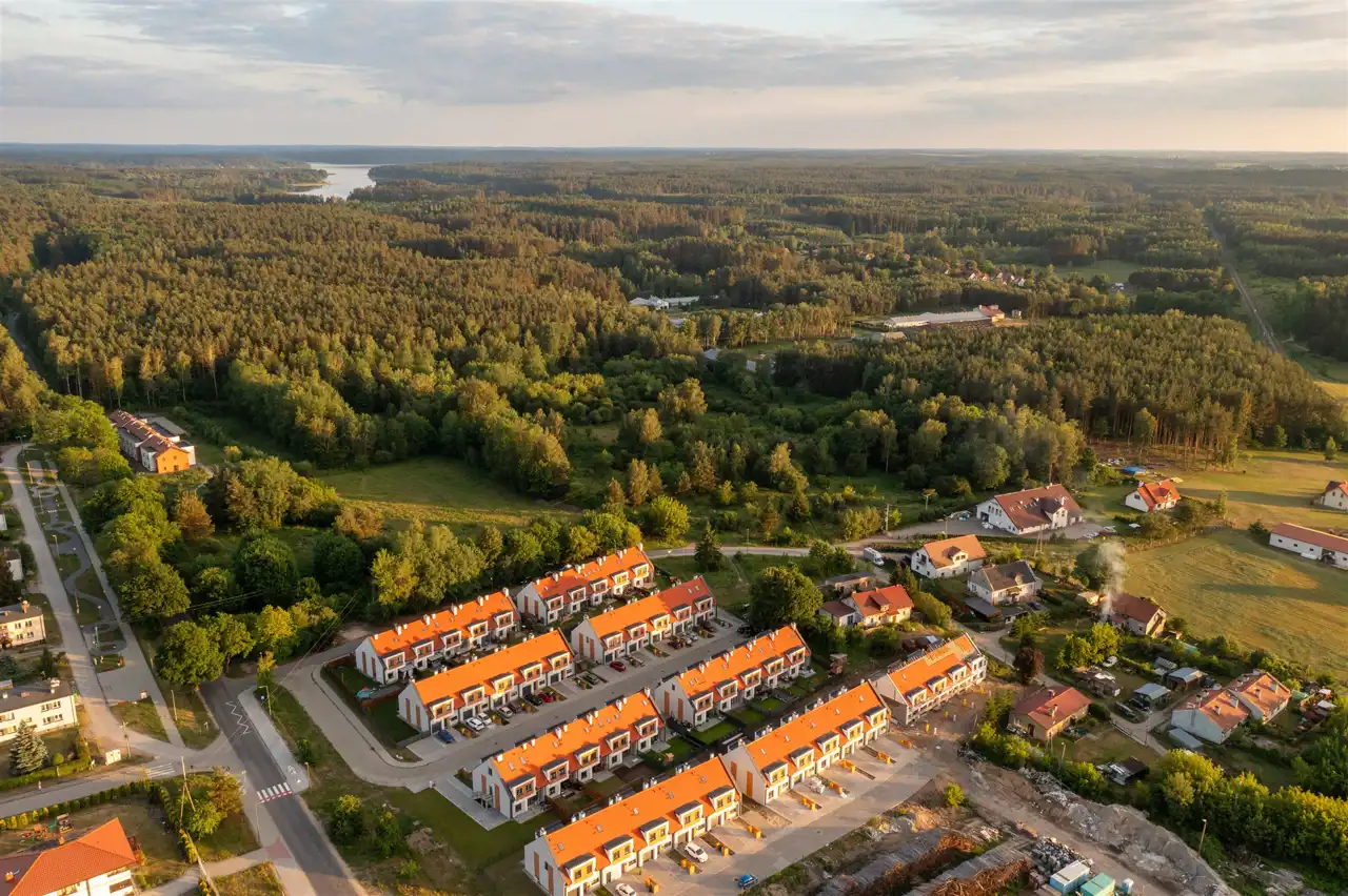 Położenie osiedla łączy w sobie komfort zamieszkania w miejscowości zapewniającej wszystkie niezbędne usługi takie jak sklepy spożywcze, gabinety lekarskie oraz usługi edukacyjne (szkoły, przedszkola) oraz otoczenie terenów o wysokich walorach przyrodniczych.