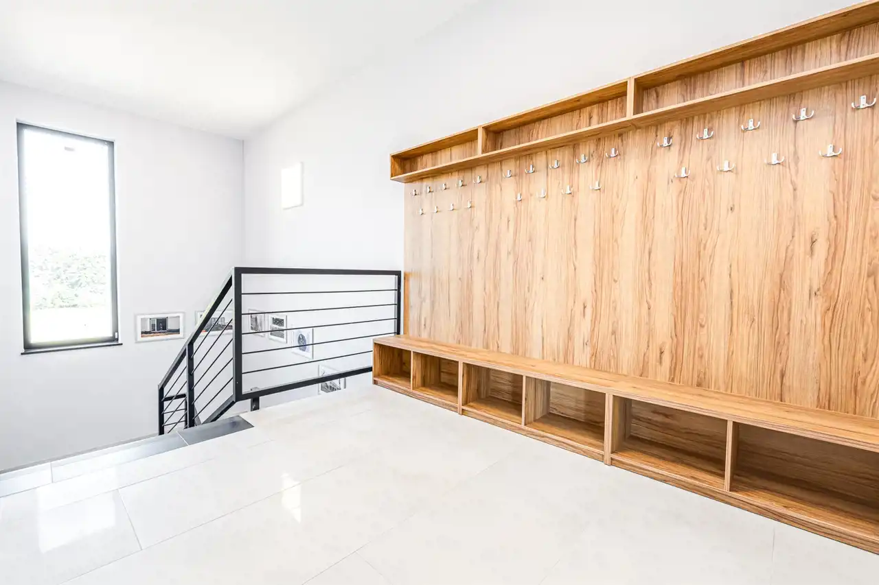 Na wejściu od klatki schodowej, przy open space, znajdują się wieszaki na ubrania dla pracowników.