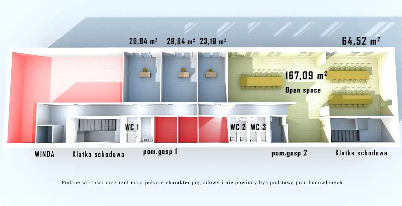 Pomieszczenia zaznaczone na czerwono nie są przedmiotem oferty najmu.
