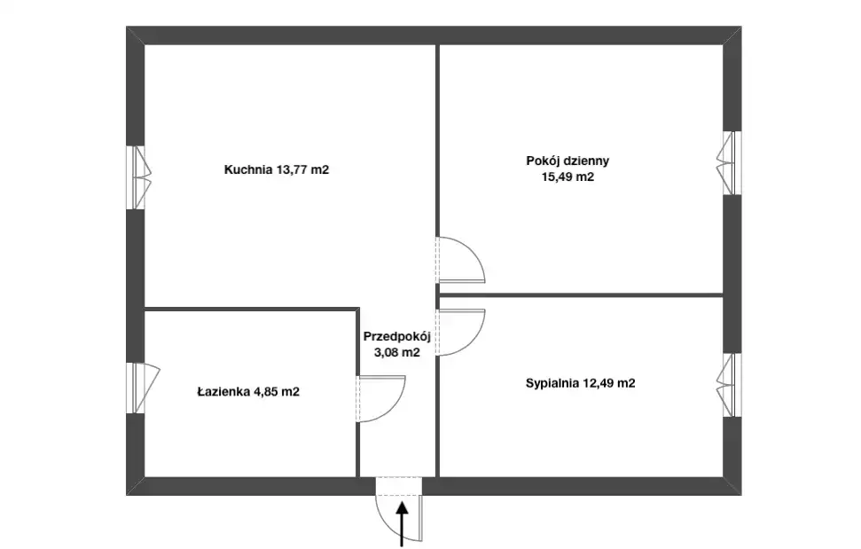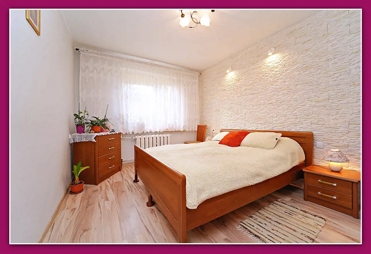 Mieszkanie składa się z oddzielnej kuchni o powierzchni 13,77 m2, dwóch oddzielnych pokoi o powierzchni 15,49 m2 i 12,49 m2, łazienki z WC 4,85 m2 oraz przedpokoju 3,08 m2. Do mieszkania przynależy także duża piwnica oraz garaż o powierzchni 14,88 m2.
