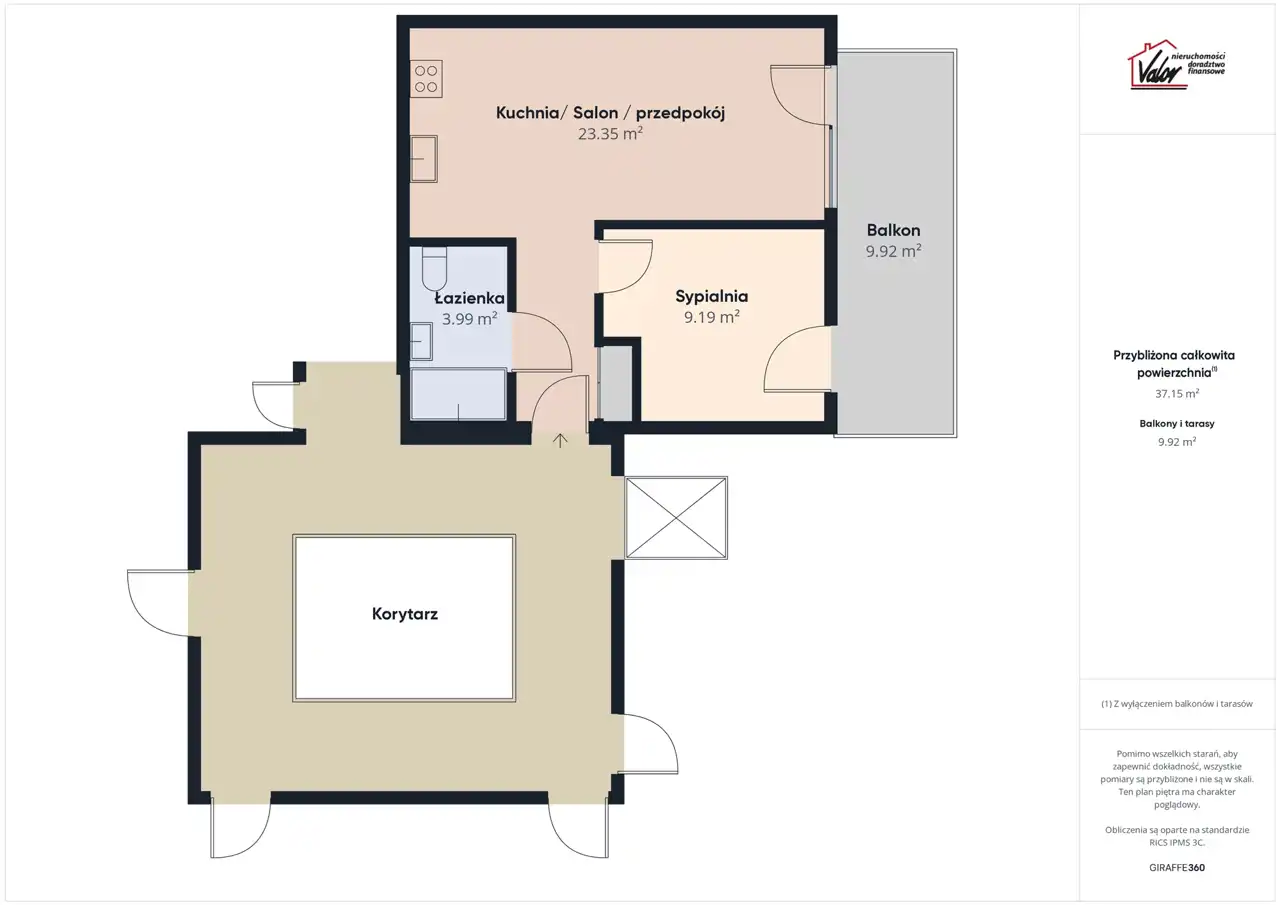 Przestronnego Salonu z aneksem kuchennym o powierzchni 19,25 m² z którego jest wejście na przestronny balkon o pow. 9,92 m2,