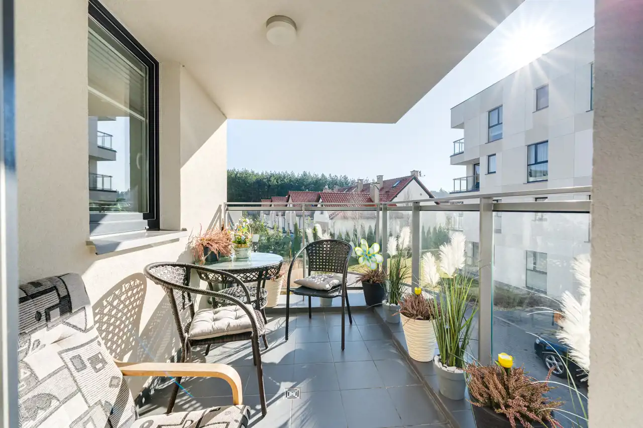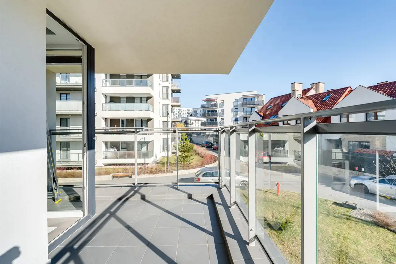 Mieszkanie posiada bardzo dobry standard wykończenia, zostało zaaranżowane w klasycznym stylu, z dominującymi barwami bieli i szarości, zarówno na ścianach, jak i zabudowach. Nieruchomość usytuowana jest na zamkniętym osiedlu, na którym znajduje się dużo ogólnodostępnych miejsc parkingowych dla mieszkańców, na osiedle wjadą tylko mieszkańcy, z uwagi na szlaban znajdujący się na wjeździe. Osiedle jest ponadto monitorowane oraz znajduje się na nim plac zabaw dla pociech mieszkańców.