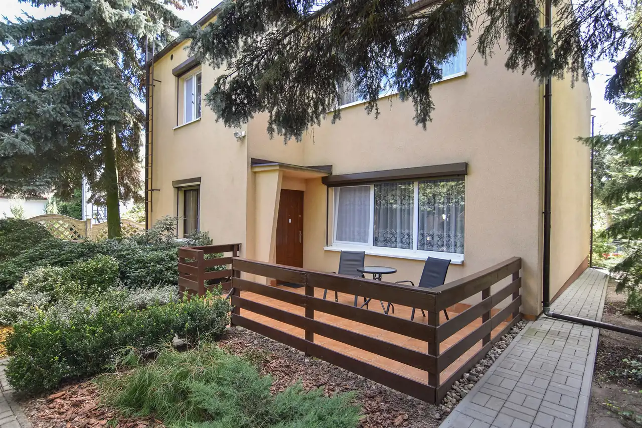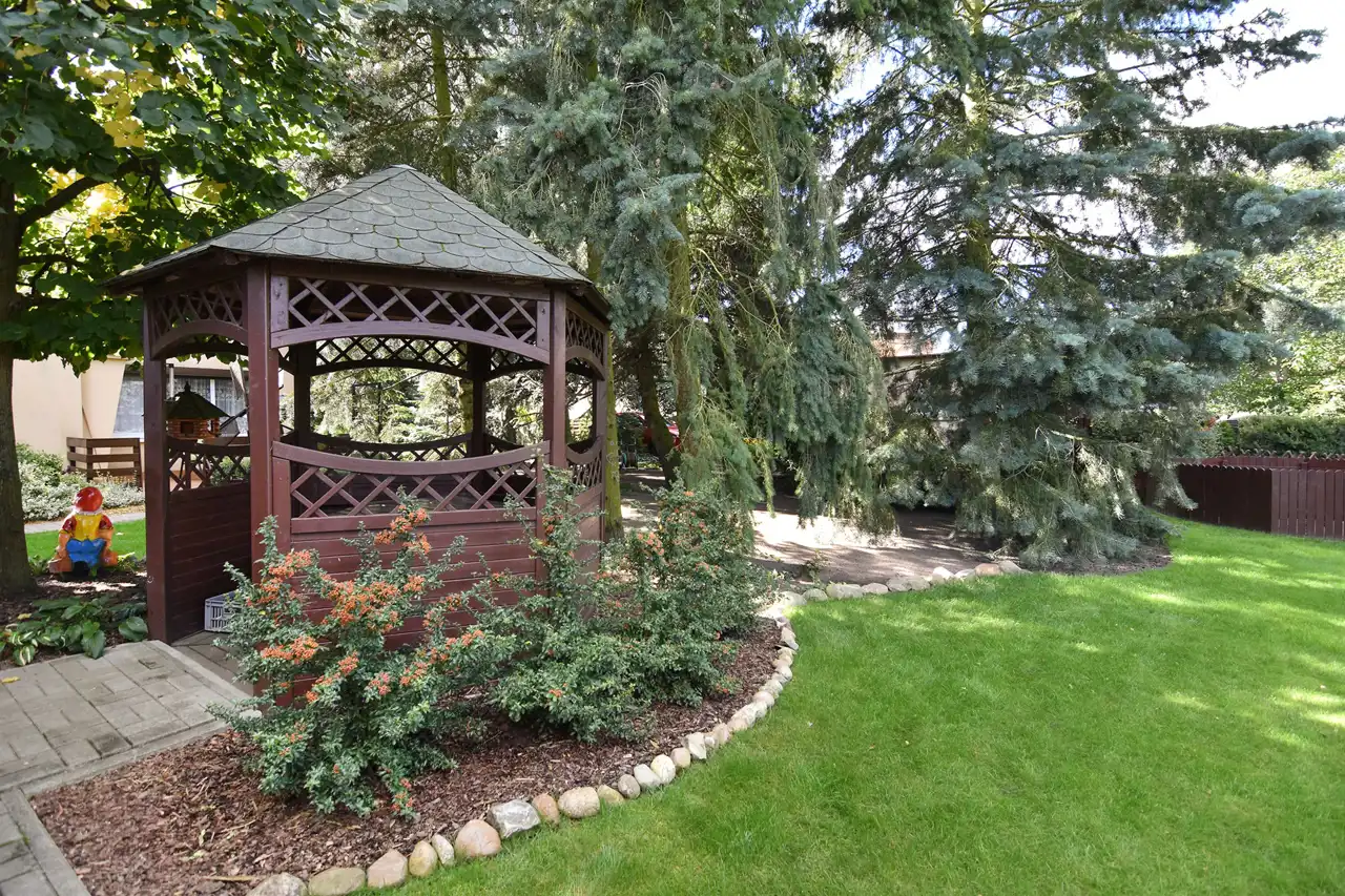 Nieruchomość jest zadbana i otoczona zielenią. Posiada duży, wypielęgnowany ogród, który częściowo porośnięty jest dużymi drzewami iglastymi, a w dalszej części zaaranżowany jako mały sad i ogród warzywny. Za domem umiejscowiono okrągłą drewnianą altanę oraz utwardzoną przestrzeń na rozkładany basen. Nieruchomość ma własną studnię z wodą do podlewania ogrodu (hydrofor zostaje). Woda deszczowa natomiast jest rozprowadzona na terenie ogrodu do podlewania drzew i krzewów.