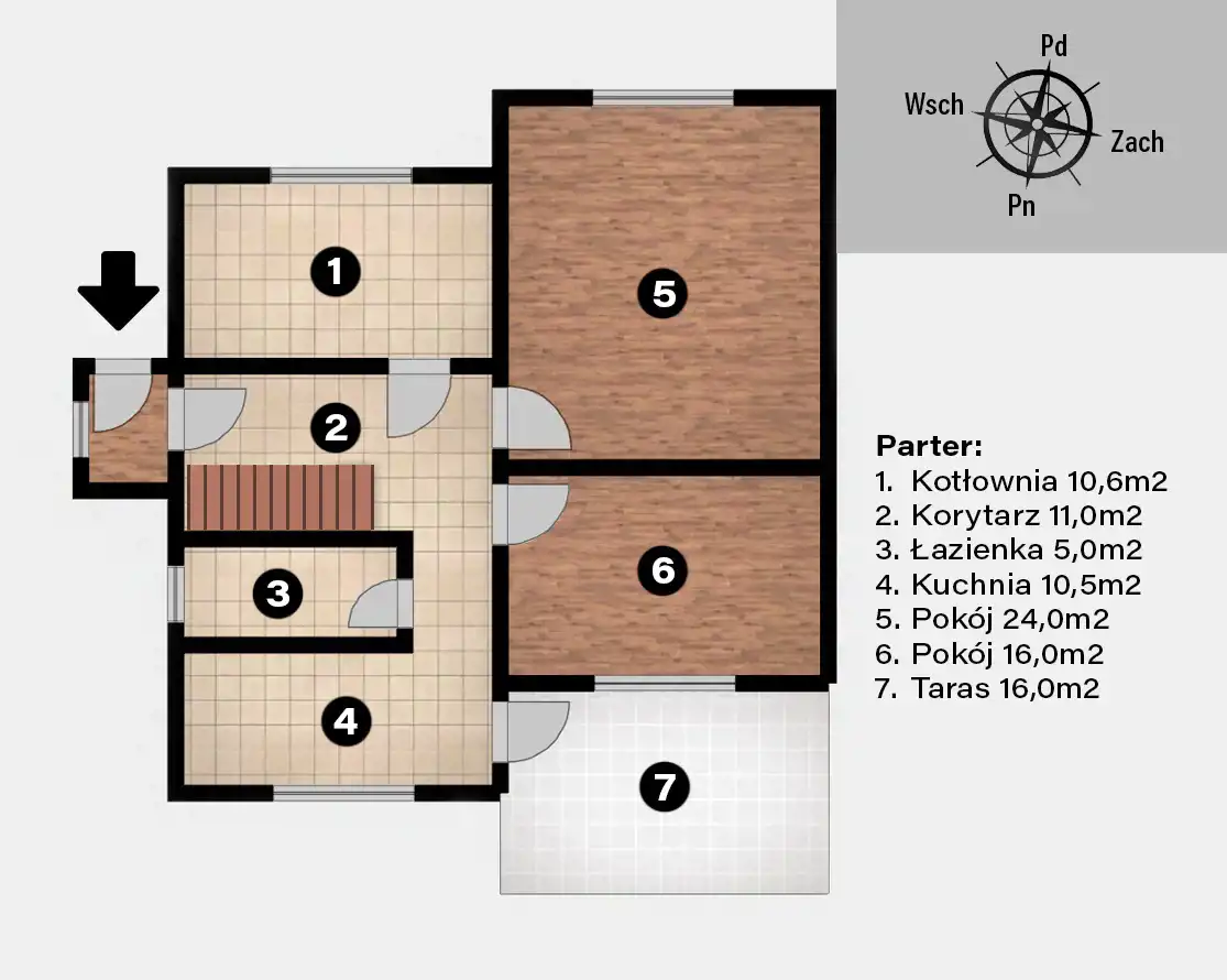 Na parterze znajdują się 2 pokoje (jeden z nich to salon z kominkiem), łazienka, kuchnia z wyjściem na taras oraz duża, jasna kotłownia. Piętro, na które prowadzą jasne dębowe schody, to 4 pokoje i łazienka. Pokoje są jasne i ustawne.