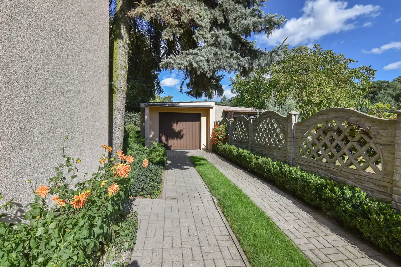 Oprócz domu na posesji znajdują się 2 spore garaże. Przy jednym jest rewelacyjna piwniczka na przetwory i wina oraz pokój z osobnym wejściem, który może pełnić funkcję biura, a przy drugim jest duże pomieszczenie warsztatowo-gospodarcze oraz drugie pomieszczenie pełniące rolę drewutni.