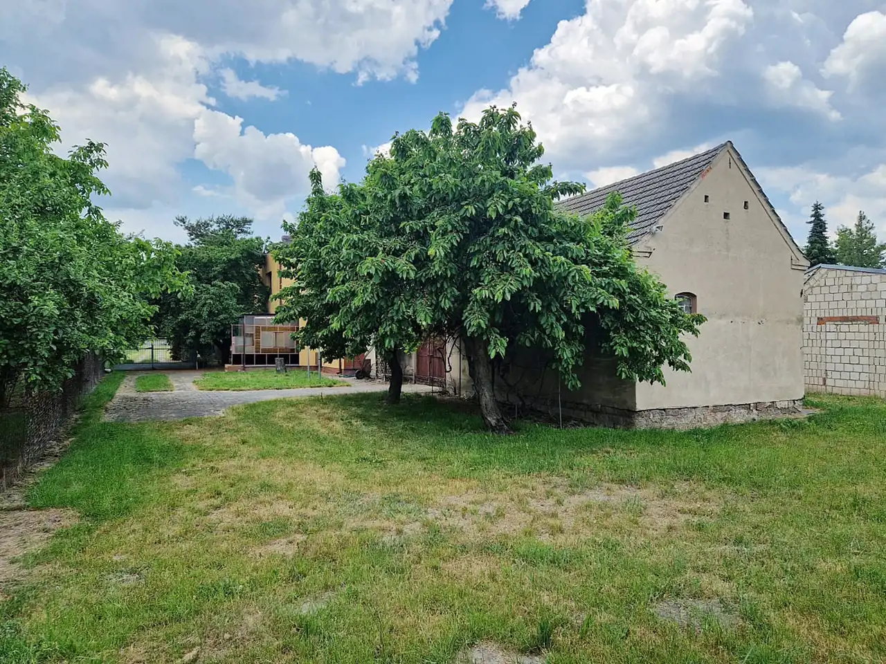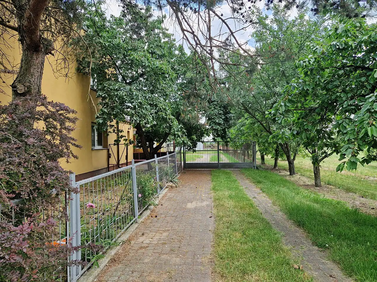Piękna, duża działka o regularnym kształcie, częściowo obsadzona drzewami owocowymi (czereśnie, śliwy, jabłonie, orzechy) ale w wiekszości porośnięta zadbana murawą, W narożniku działki znajduje się dwukondygnacyjny budynek mieszkalny (zabudowa bliźniacza) z płaskim dachem, składający się z 5-u pokoi, kuchni z jadalnią, dwóch łazienek, wc i kotłowni.