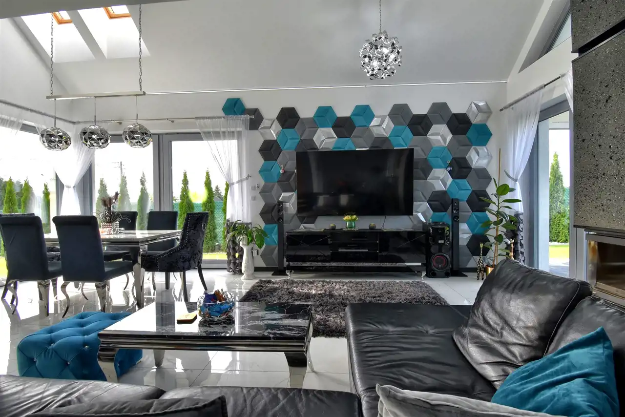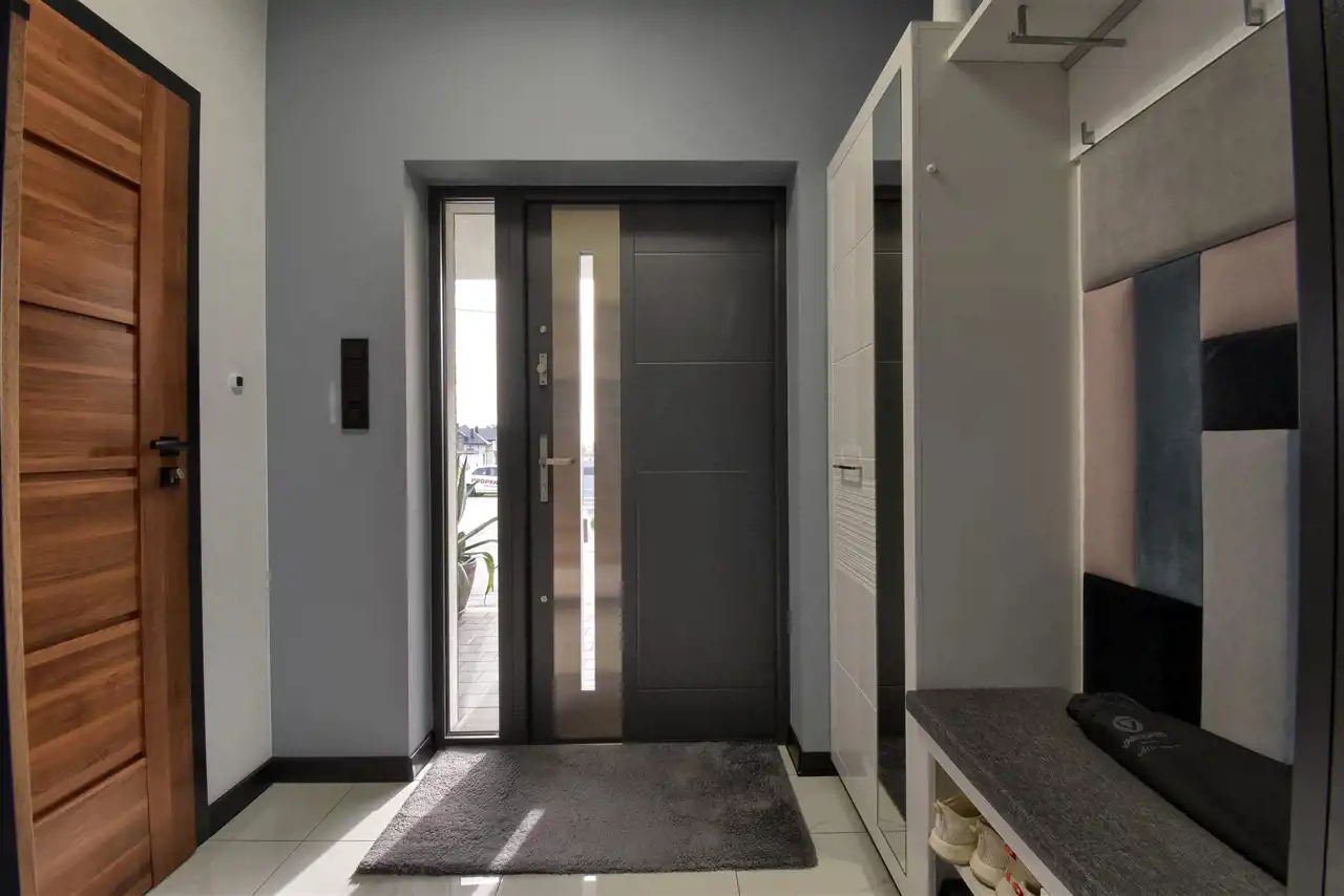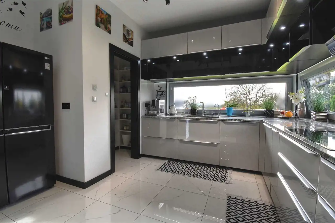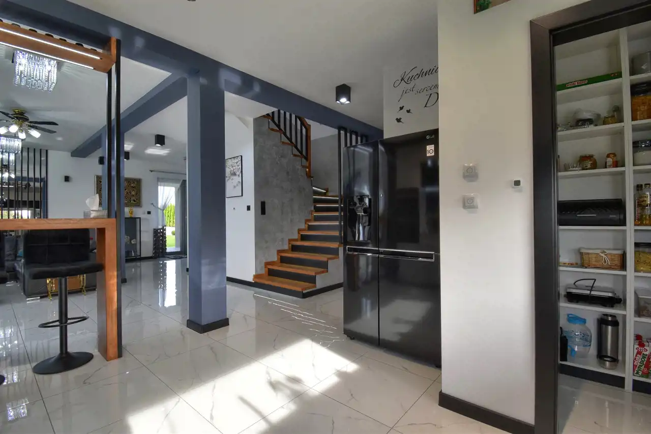 Budynek wzniesiony w 2021 roku. Materiał konstrukcyjny: H+H + styropian grafitowy 20 cm + tynk mineralny, dach kryty płaską dachówką ceramiczną RABEN, okna PCV firmy Jezierski trzyszybowe duo color, na ścianach gładź oraz elementy dekoracyjne.