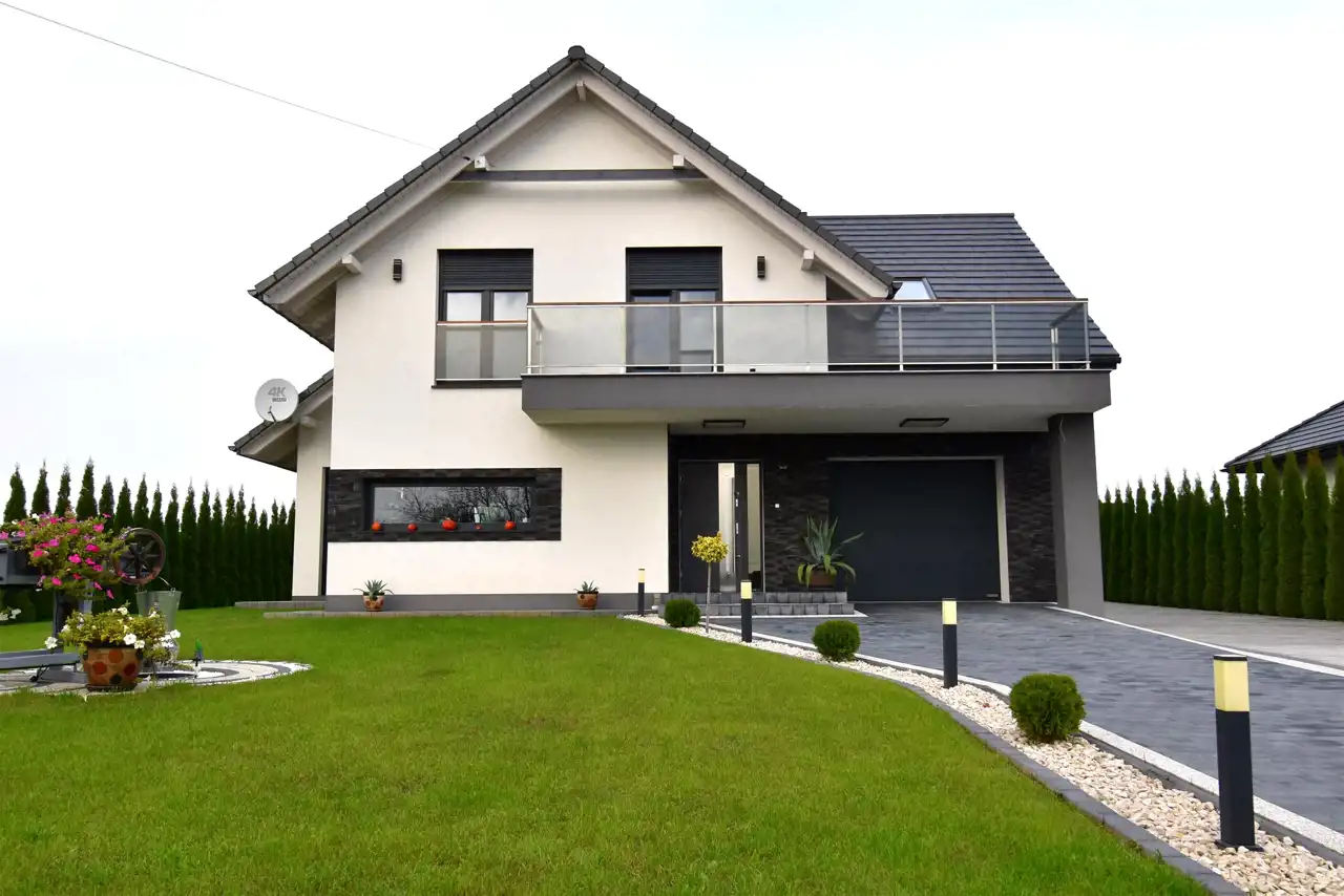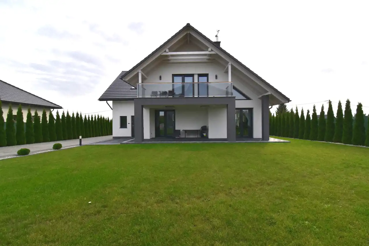 The building was constructed in 2021. Construction material: H+H blocks with 20 cm graphite EPS insulation and mineral plaster, roof covered with flat ceramic tiles by RABEN, triple-glazed PVC windows from Jezierski with dual color, smooth walls, and decorative elements.