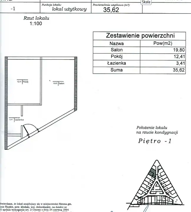 Nieruchomość znajduje się na 1 piętrze, posiada 35,62 m2 powierzchni użytkowej, składa się z salonu, sypialni, łazienki i przedpokoju.