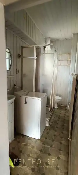 Budynek wzniesiony w 1960 roku z pustaka, nieocieplony, dach płaski kryty papą (wymieniona 4 lata temu). Media: prąd, gaz, woda miejska, szambo, siła. Działka w całości ogrodzona. Ogrzewanie piecem węglowym IV kategorii. Okna PCV. Na działce znajduje się budynek gospodarczy z przeznaczeniem do rozbiórki.