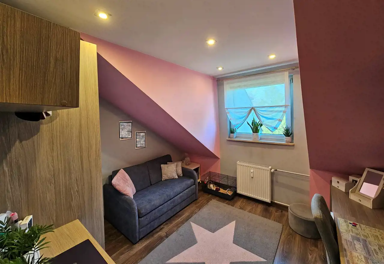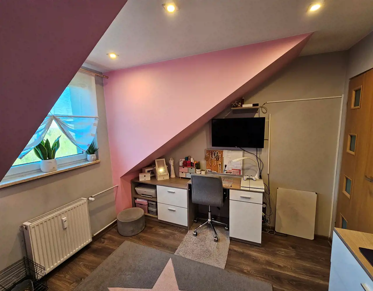 Powierzchnia mieszkania które usytuowane jest na poddaszu wynosi 39,14 m2 na którą składają się pomieszczenia nieprzechodnie takie jak: