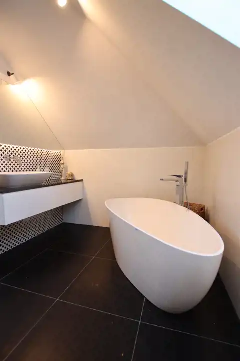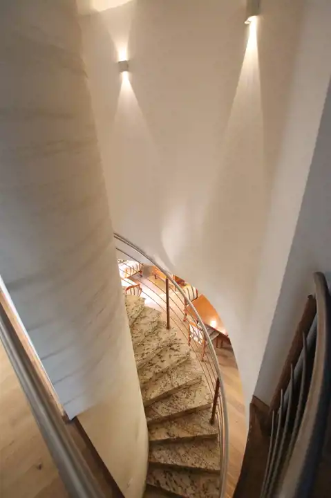 W domu zastosowano wysokiej jakości materiały wykończeniowe, m.in. drewniane podłogi oraz elementy kamienne.