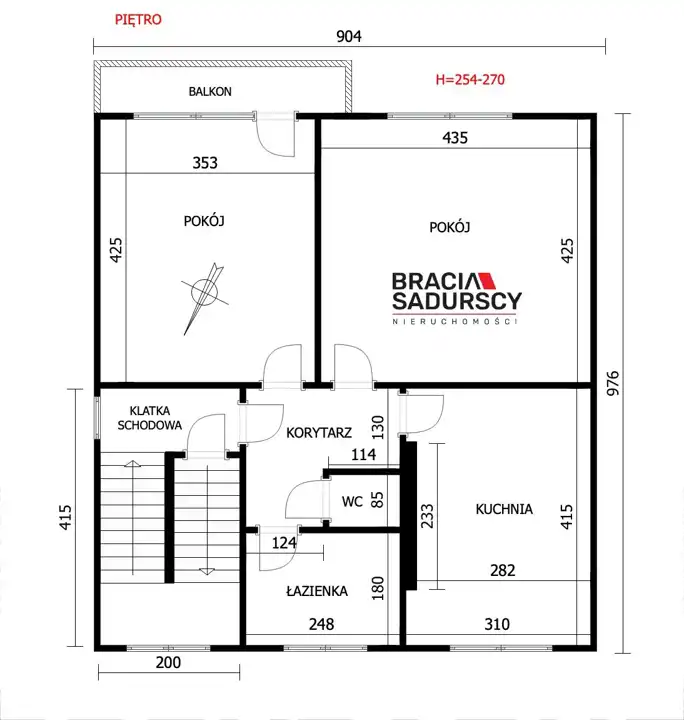 na piętrze: 2 pokoje (18,48 i 15,00 m2), kuchnia (12,14 m2), korytarz (4,40 m2), komunikacja (5,15 m2), łazienka (4,46 m2), WC (0,97 m2), balkon.