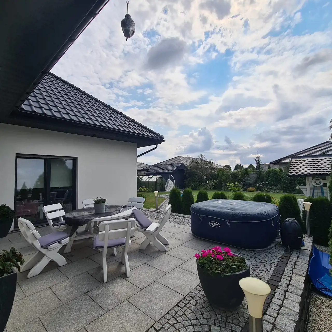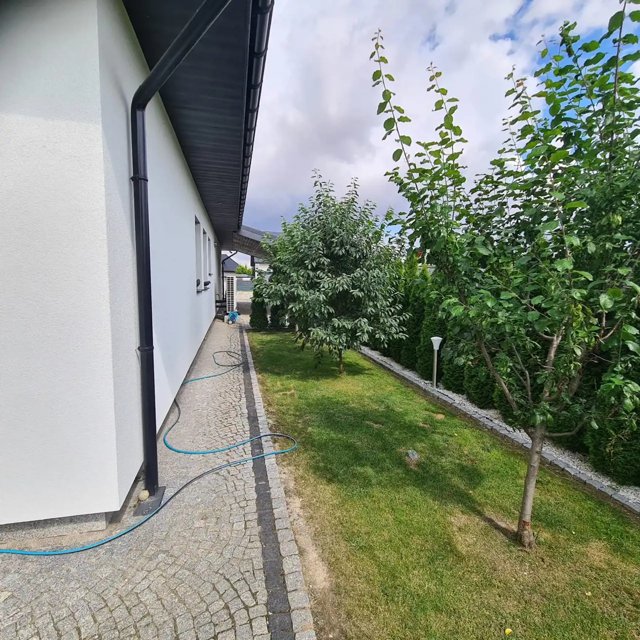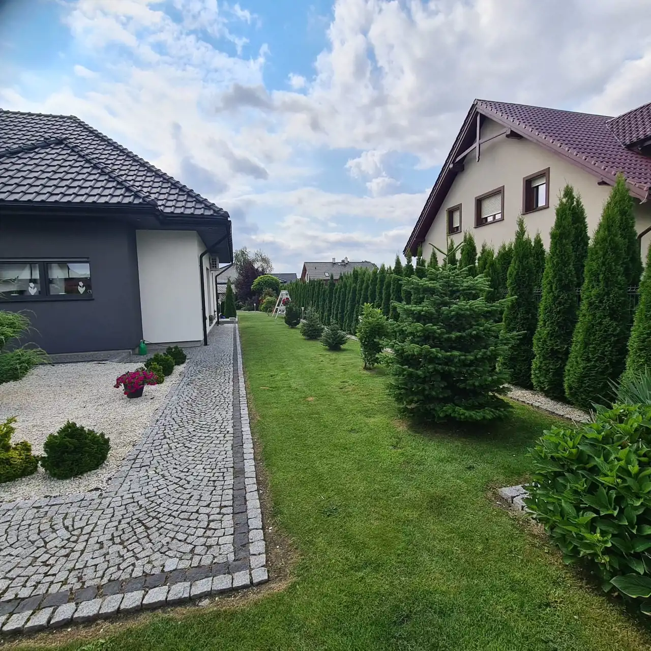 Pięknie zagospodarowana działka z nasadzeniami, ogrodzona, komunikacja wykonana z kostki granitowej.