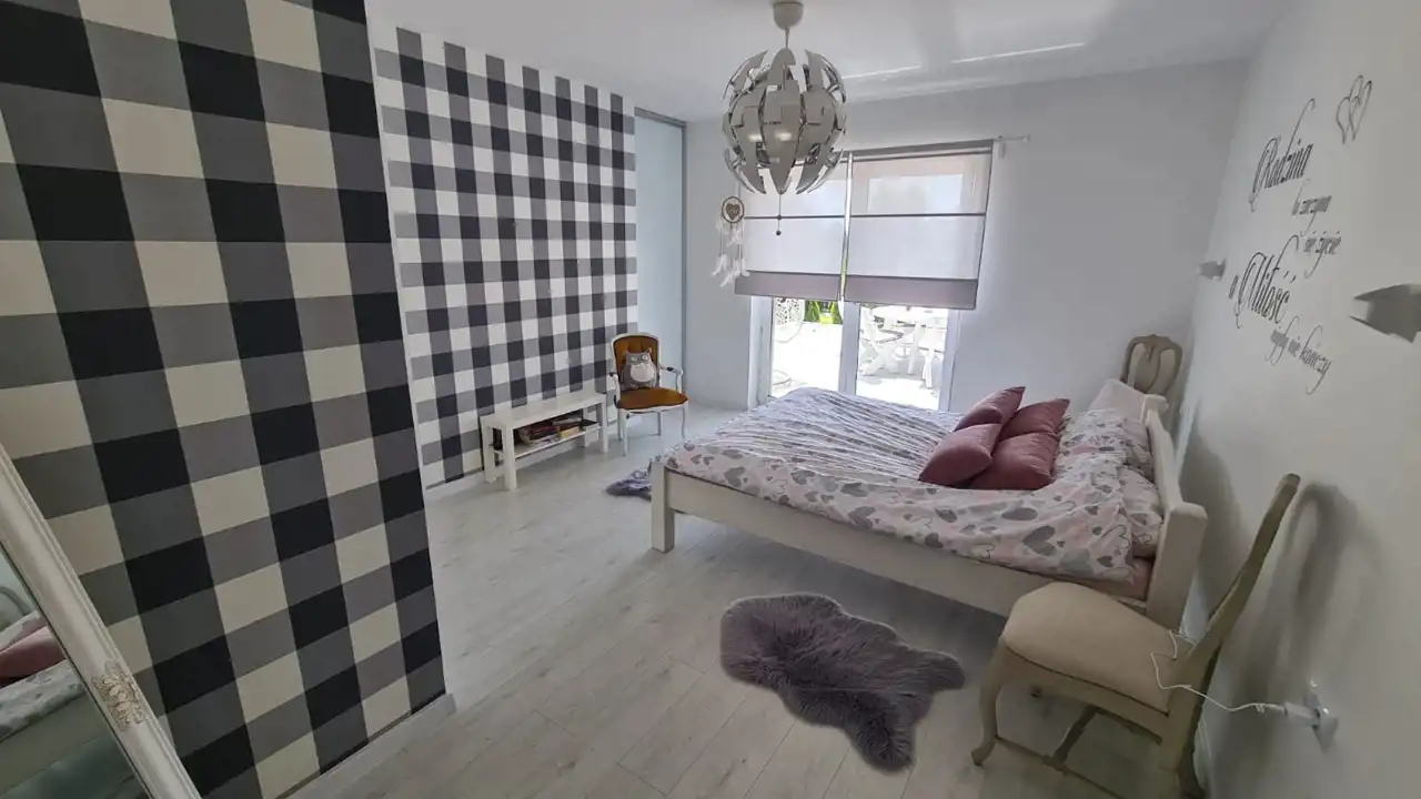 PARTER (183 m2 z garażem): wiatrołap, hall, salon z wyjściem na taras oraz otwarty na kuchnię, dwa pokoje (każdy 22m2), łazienka razem z wc, osobno wc oraz przejście do pralni oraz garażu. Salon z kominkiem wykończony płytkami gresowymi oraz ozdobnym betonem architektonicznym, ściany pokryte tynkiem cementowo-wapiennym oraz głądzią, oświetlenie ledowe, rolety zewnętrzne. Kuchnia ze spiżarnią, zabudowana, wyposażona w sprzęt AGD, blaty kamienne. Pokoje wyposażone w zabudowane szafy typu Komandor, wykończone panelami "dąb skandynawski", stolarka drzwiowa drewniana firmy Porta. Łazienka z oknem, z wc, wyposażona w kabinę prysznicową, bidet, wykończona stylowymi płytkami gresowymi. Osobno WC wykończone glazurą.